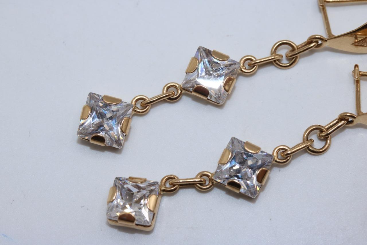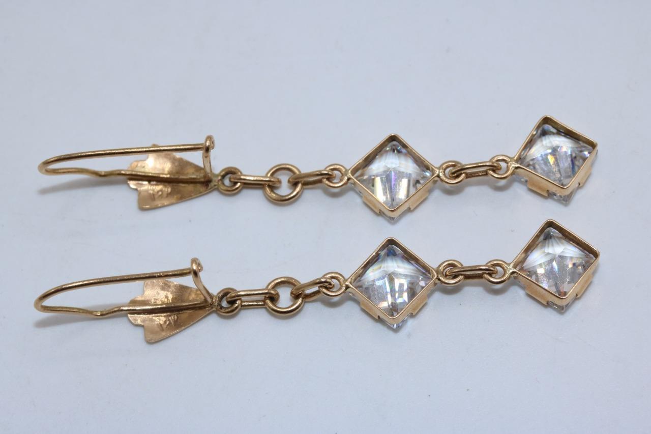 Vintage 18K Yellow Gold Clear Stone Double Square Dangle Earrings 2" Drop 3.9 gr