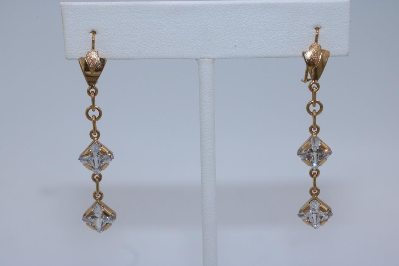Vintage 18K Yellow Gold Clear Stone Tilted Squares Dangle Earrings 2" Drop