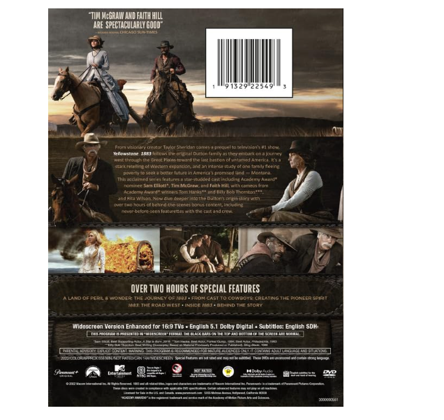 From visionary creator Taylor Sheridan comes a prequel to television’s #1 show, Yellowstone. 1883 follows the original Dutton family as they embark on a journey west through the Great Plains toward the last bastion of untamed America. It’s a stark retelling of Western expansion, and an intense study of one family fleeing poverty to seek a better future in America’s promised land — Montana. This acclaimed series features a star-studded cast including Academy Award nominee Sam Elliott, Tim McGraw, Faith Hill, with cameos from Academy Award winners Tom Hanks and Billy Bob Thornton, and Rita Wilson. Now dive deeper into the Dutton’s origin story with over X hours of behind-the-scenes bonus content including never-before-seen featurettes with the cast and crew.