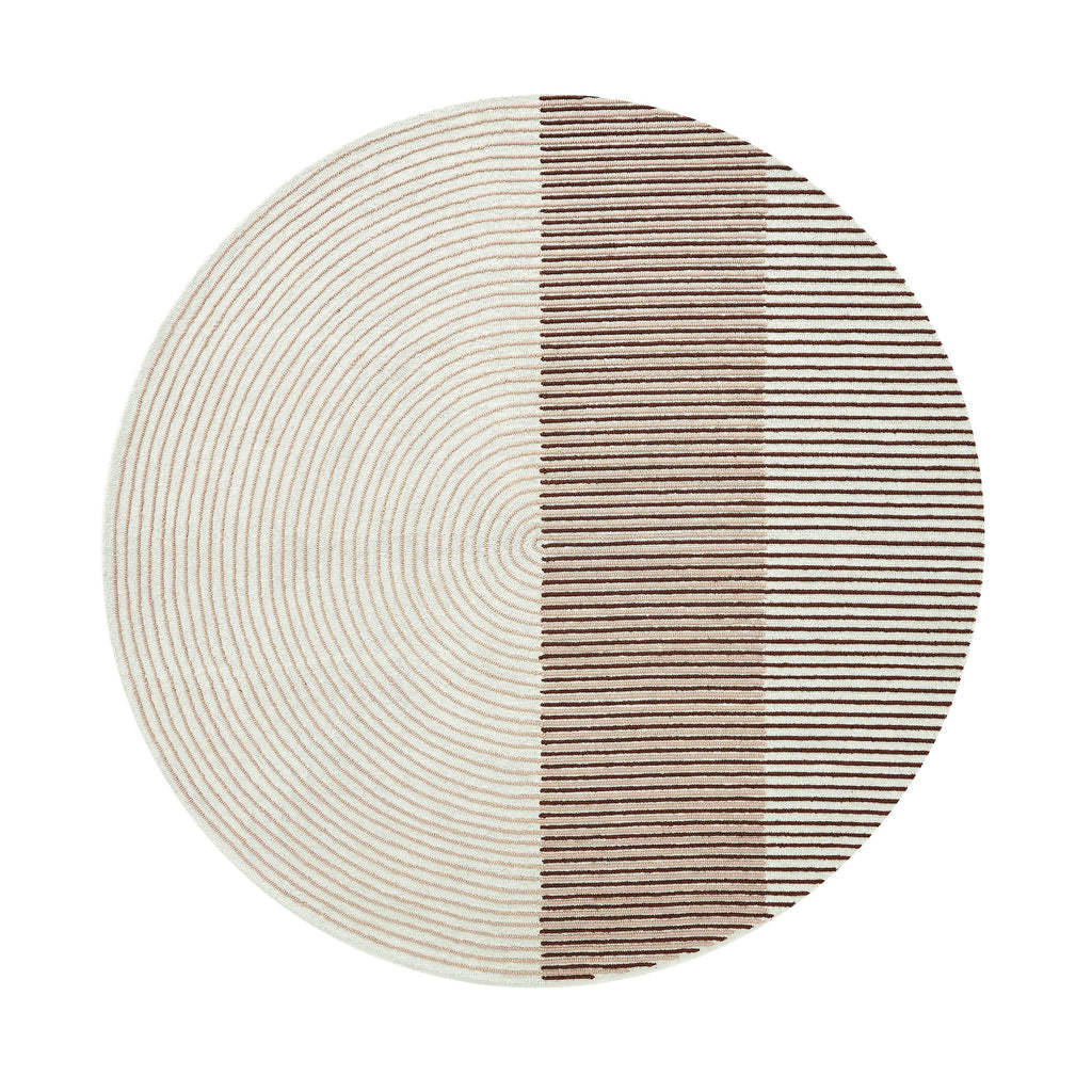 Add a touch of modern sophistication to your space with this handmade round wool rug, featuring a unique half-and-half design with concentric circles on one side and linear stripes on the other. The white and rust brown tones make it versatile, blending seamlessly with both contemporary and rustic interiors.