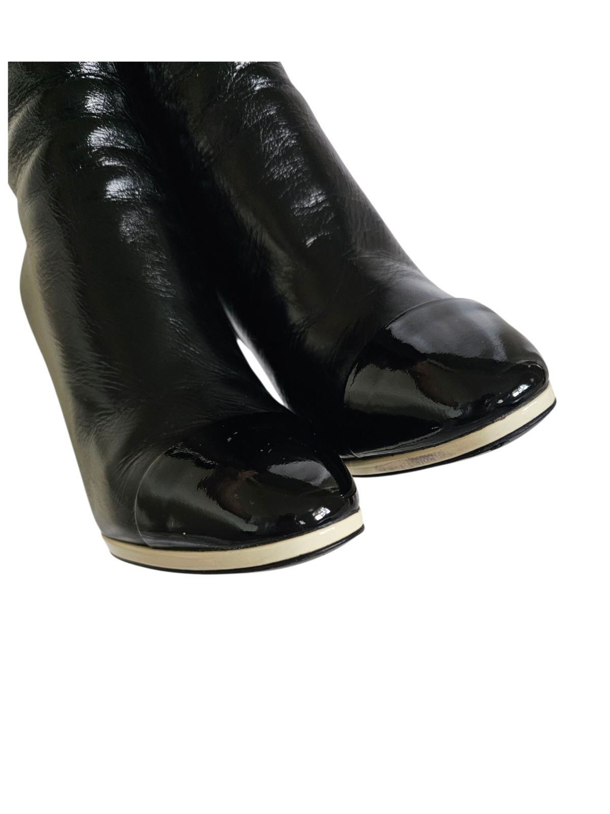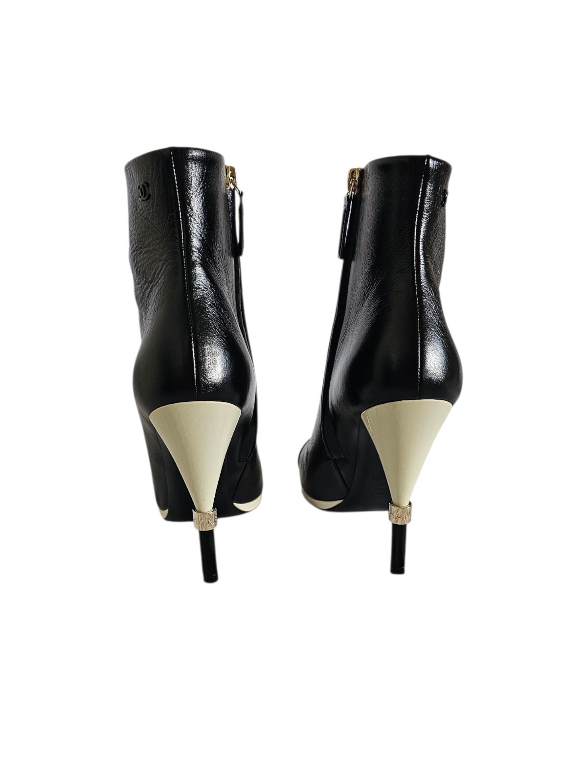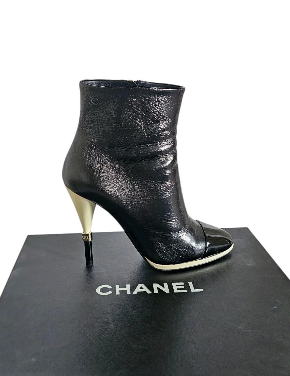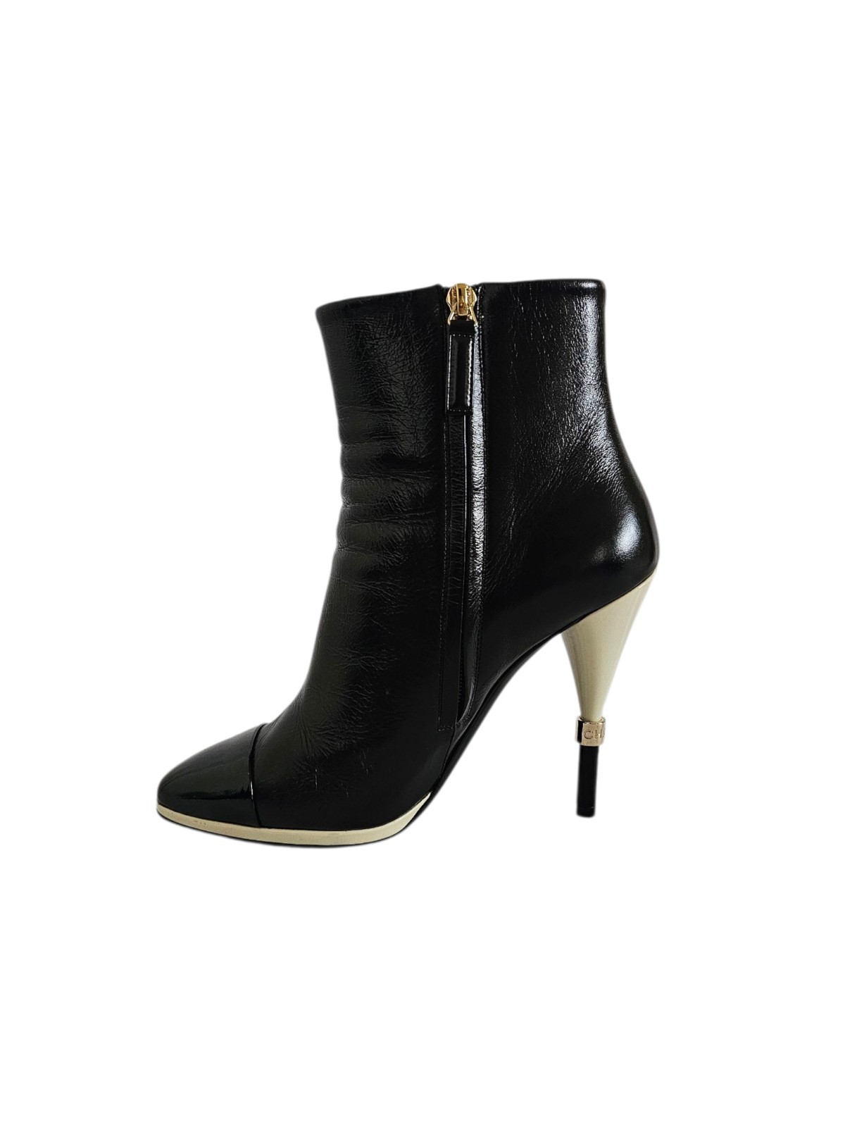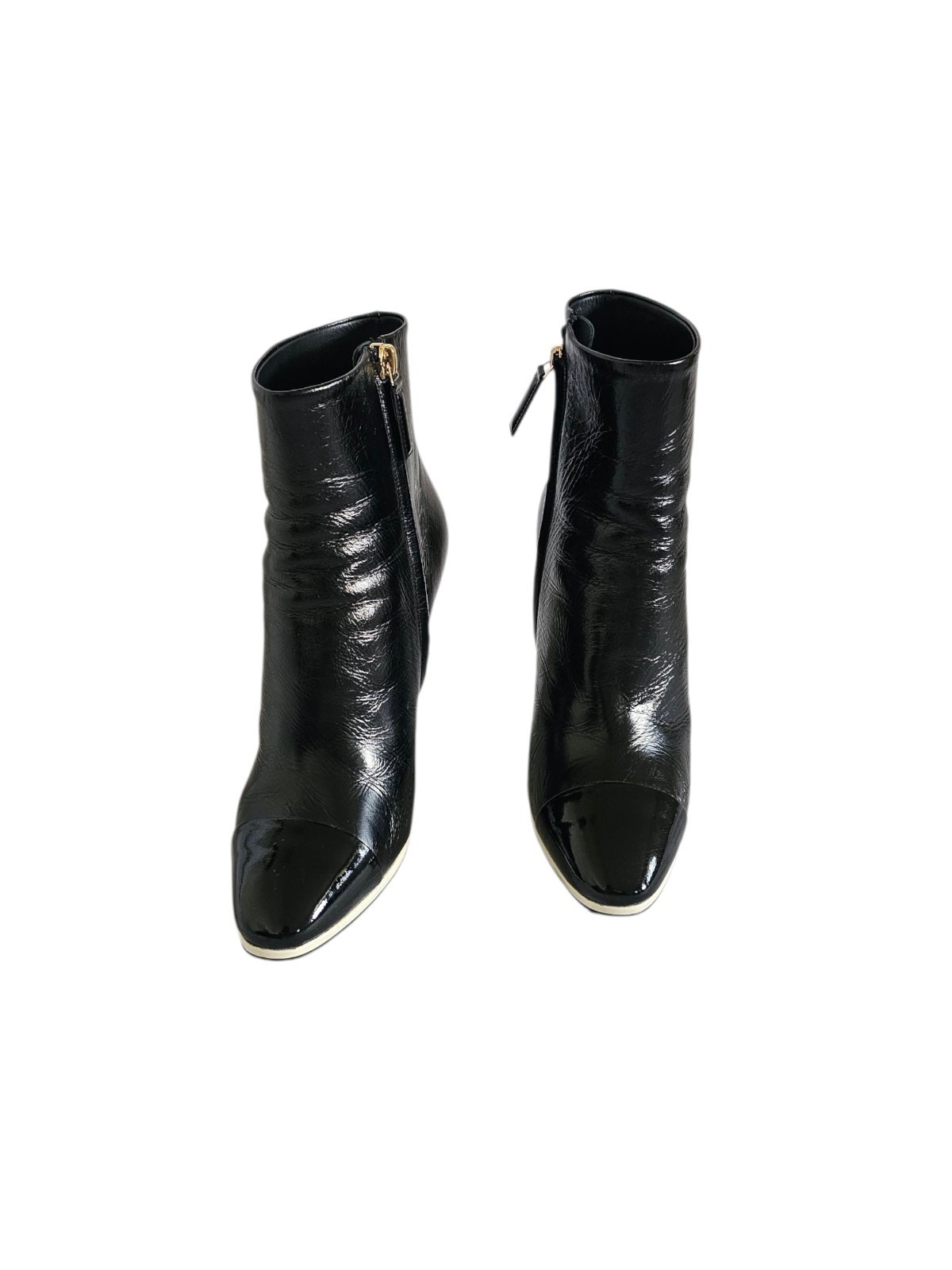 CHANEL CC Karl Lagerfeld Black Captoe Patent Ankle Heel Booties Boots 38