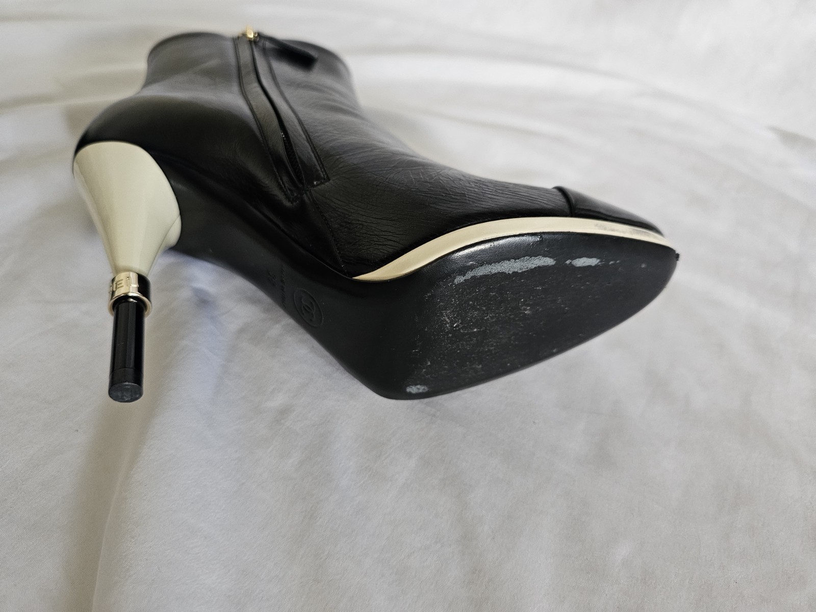 Condition pre-owned. Comes in original box. With an extra pair of heel tips/caps. No dust bag. Light marks onto the shoe Gumline. Otherwise, there are no scratches or scuffs. Zipper works exellent. Non smoking