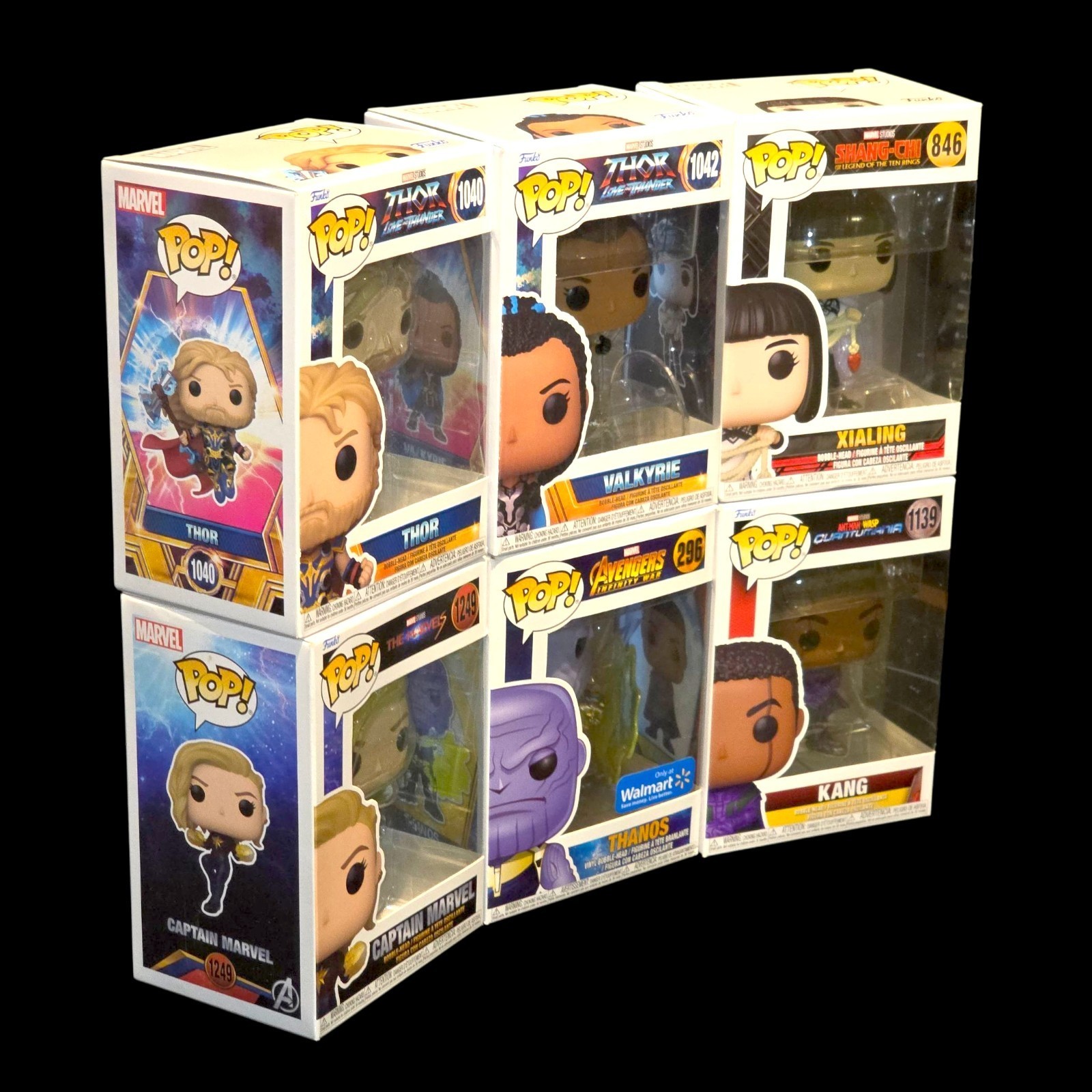 This lot of 6 Funko POP! Marvel Studios Vinyl Figures includes original boxes and features characters from the Marvel franchise. Each vinyl figure stands at 4 inches tall and comes from the Pop! Vinyl product line by Funko. These collectibles are in unopened packaging and are part of the Marvel Collector Corps exclusive event/retailer release, making them a sought-after item for fans and collectors.