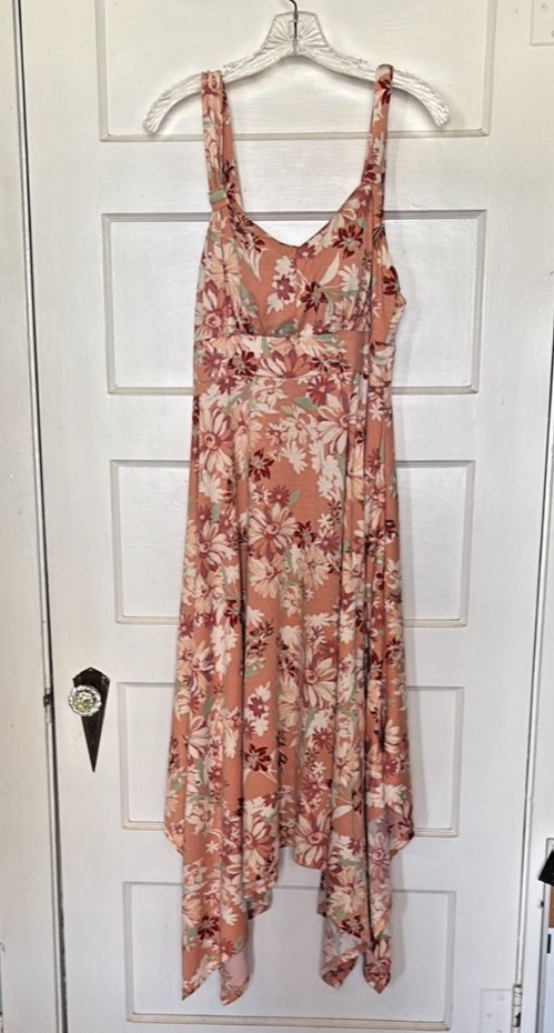 Derek Heart Floral Peach Dress Size L. Embrace elegance with this stunning floral peach dress. Perfect for any occasion, it features a flowing design that adds a touch of sophistication to your wardrobe. Armpit to armpit measures 20?. Shoulder to hem is 56? on the long points. Built in bra - Asymmetrical hem. 95% Polyester, 5% Spandex and Machine Washable. Very Good Used Condition - See Photos for further description.