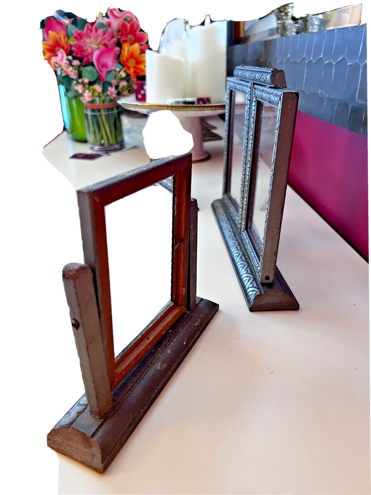 The swivel frame has no glass; but the double frame has glass included, 1 is a swing frame and the double is a swivel frame. The 3rd one is a regular one with glass but it matches the other ones in color and era. They all are in good vintage/antique condition with some minor wear that you would expect from age.