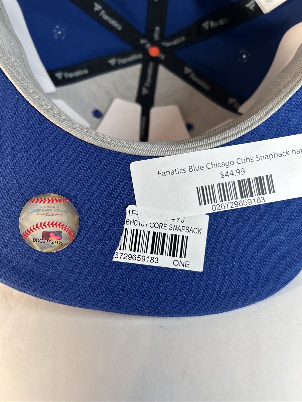 The Chicago Cubs Fanatics Blue Snapback Cap is an officially licensed baseball cap featuring the team colors and logo of the Chicago Cubs. Made by Fanatics, this one-size cap is perfect for any Major League Baseball fan looking to show their support for the team in style. Whether worn to a game or during everyday activities, this cap is a must-have accessory for any Cubs fan.