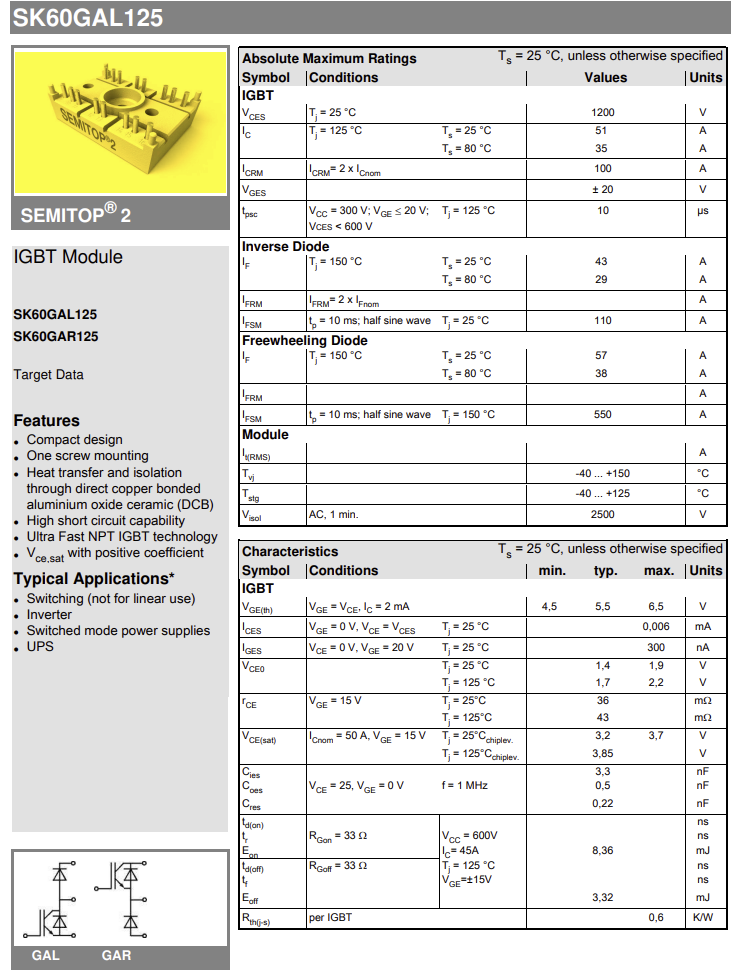 New Box of 112 Pieces - SK60GAL125 Semikron 1200V 50A IGBT Module SEMITOP2 - Compact High-Efficiency Power Switching Device