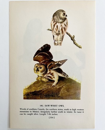 Saw Whet Owl 1950 Lithograph Art Print Audubon Bird First Edition DWU14D