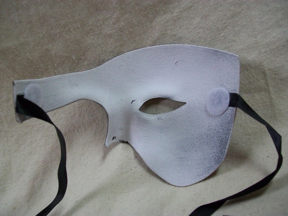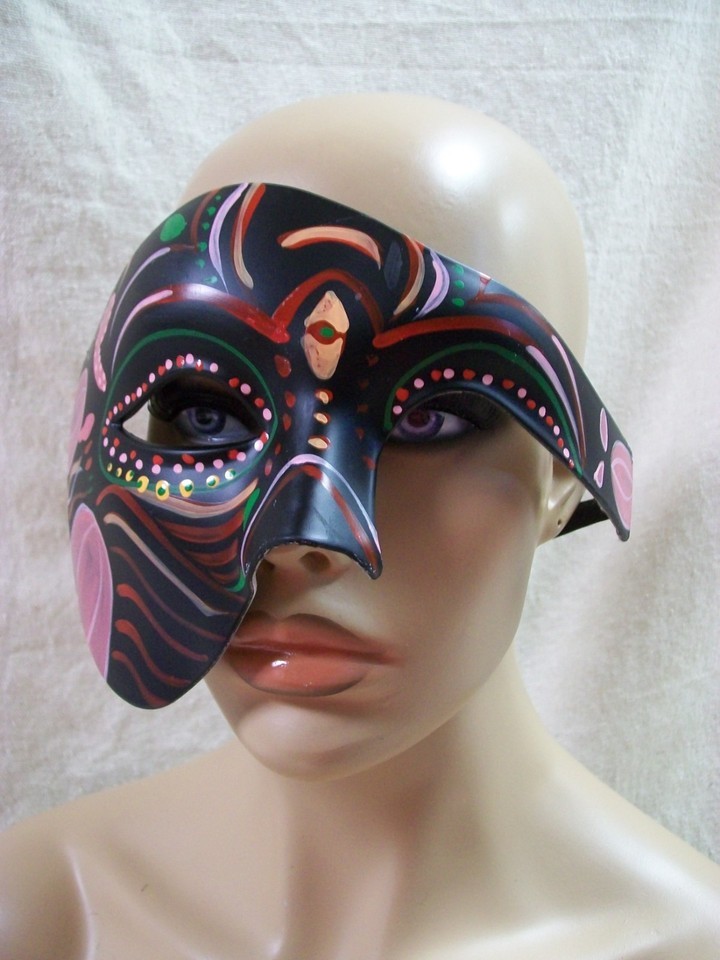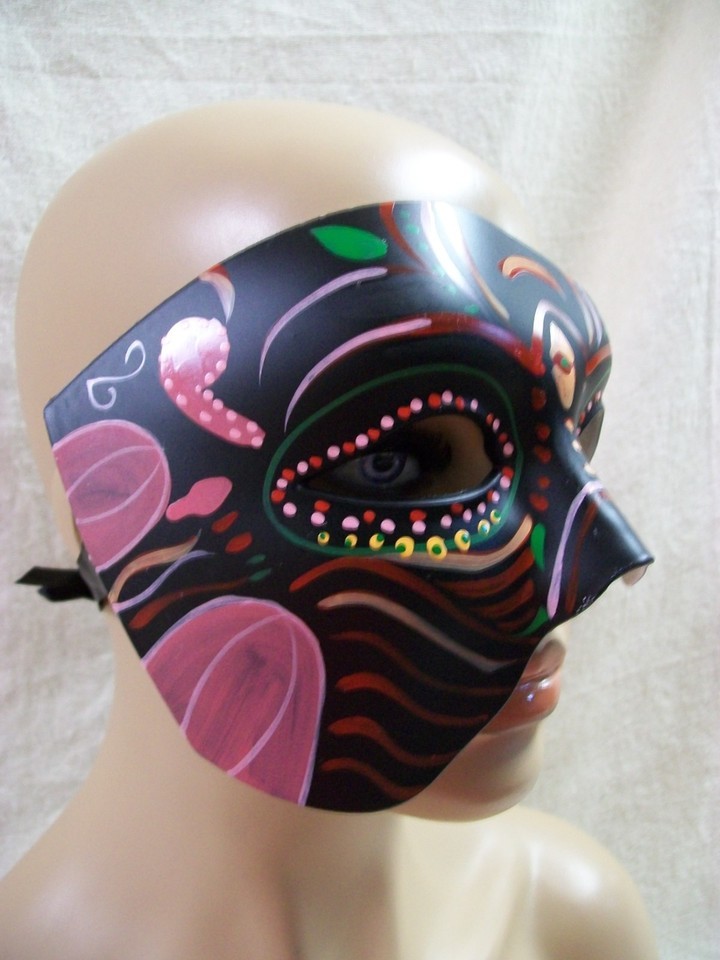 Half face mask. Like phantom of the opera. Colorful. Finish will mark / scuff easily. Has ribbon ties on the sides. Only covers part of the face. Some scuffs or scratches in the finish. Looks to be handpainted as some of the lines are wobbly with brushmarks. Each mask may vary slightly. Some excess paint on the backside. These types of masks are great for parties because it's easy to talk or eat, etc. Adult. On Size Fits Most. Unisex. No tags or ages specs but most costume items are for ages 14 and up. Not sure of the specific material content.