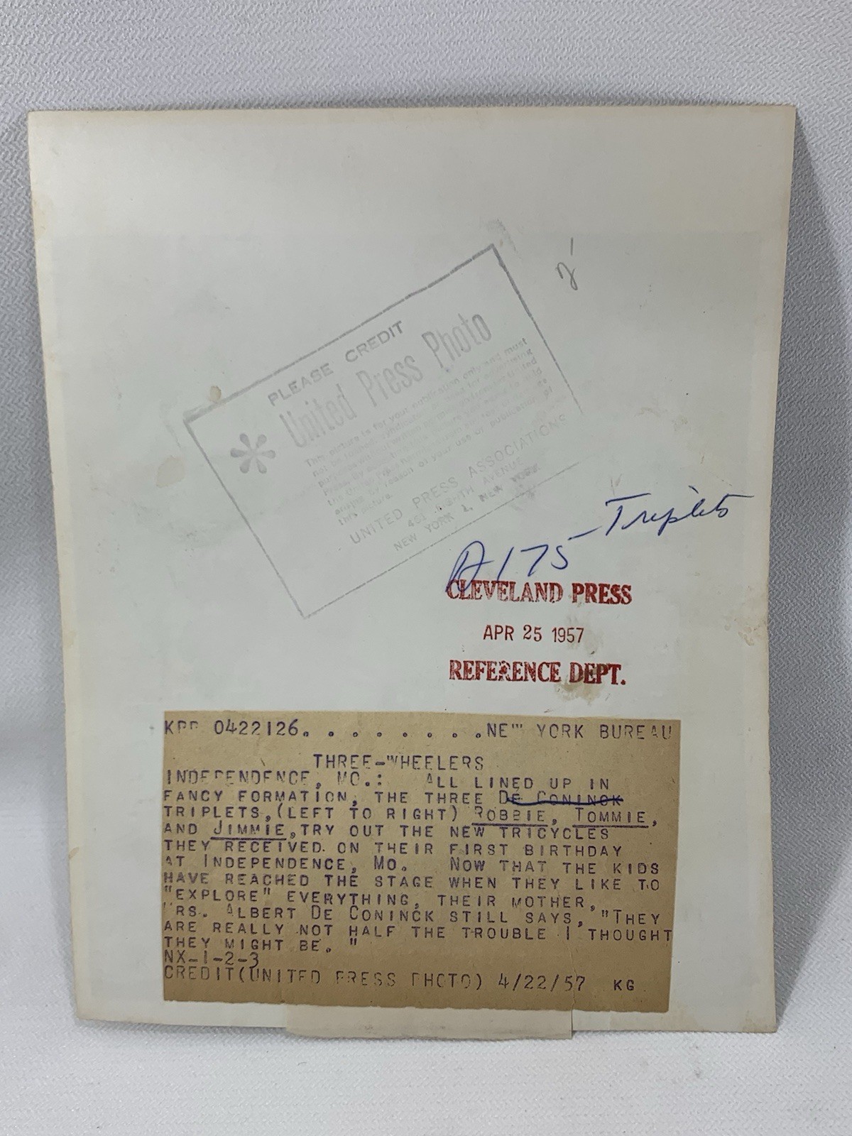 This is a pretty cool picture from the past, showing 3 kids - triplets, trying out their new independence with matching tricycles on their first birthdays! This is from the Cleveland Press Reference Dept. April 25, 1957! Credits to UNITED PRESS PHOTO/ASSOCIATION.