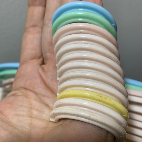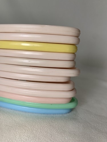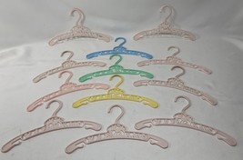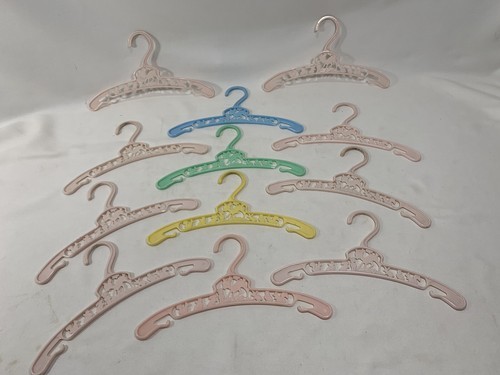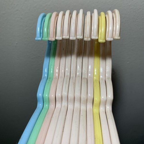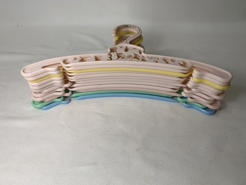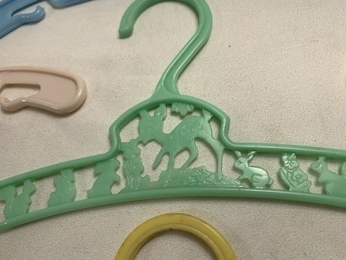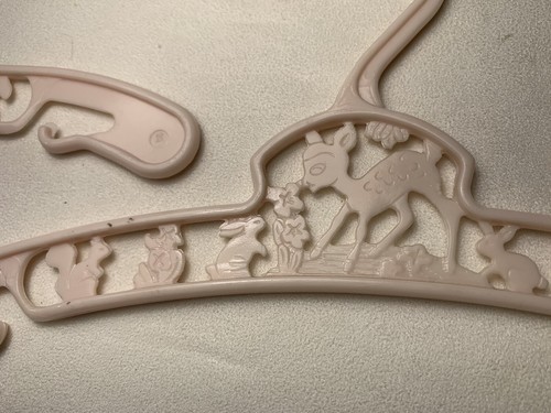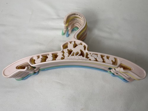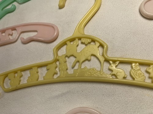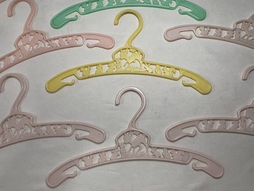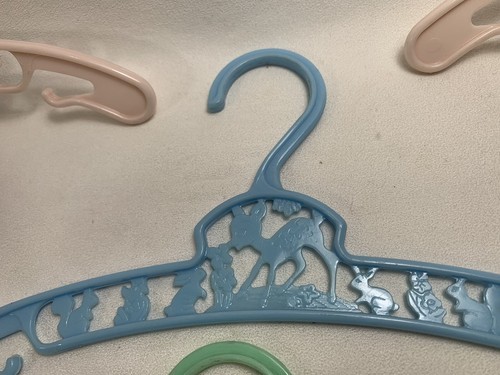 These are the cutest little hangers. They are pastel in color with characters as a deer, bunny, squirrel, with some floral areas. They are made in New York U.S.A. These are in good gently used condition. On yellow and green ones the deer has one leg that is not complete, but looks like it was made that way. Both cases the tip is smooth and rounded.