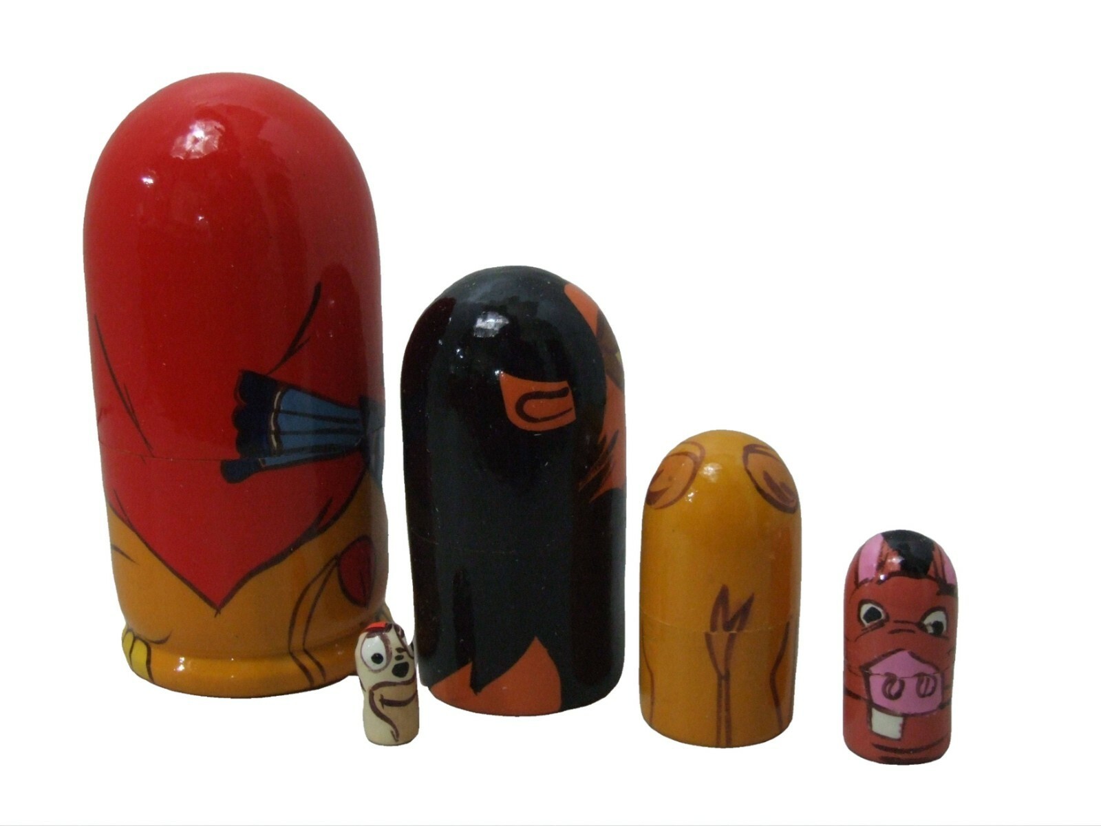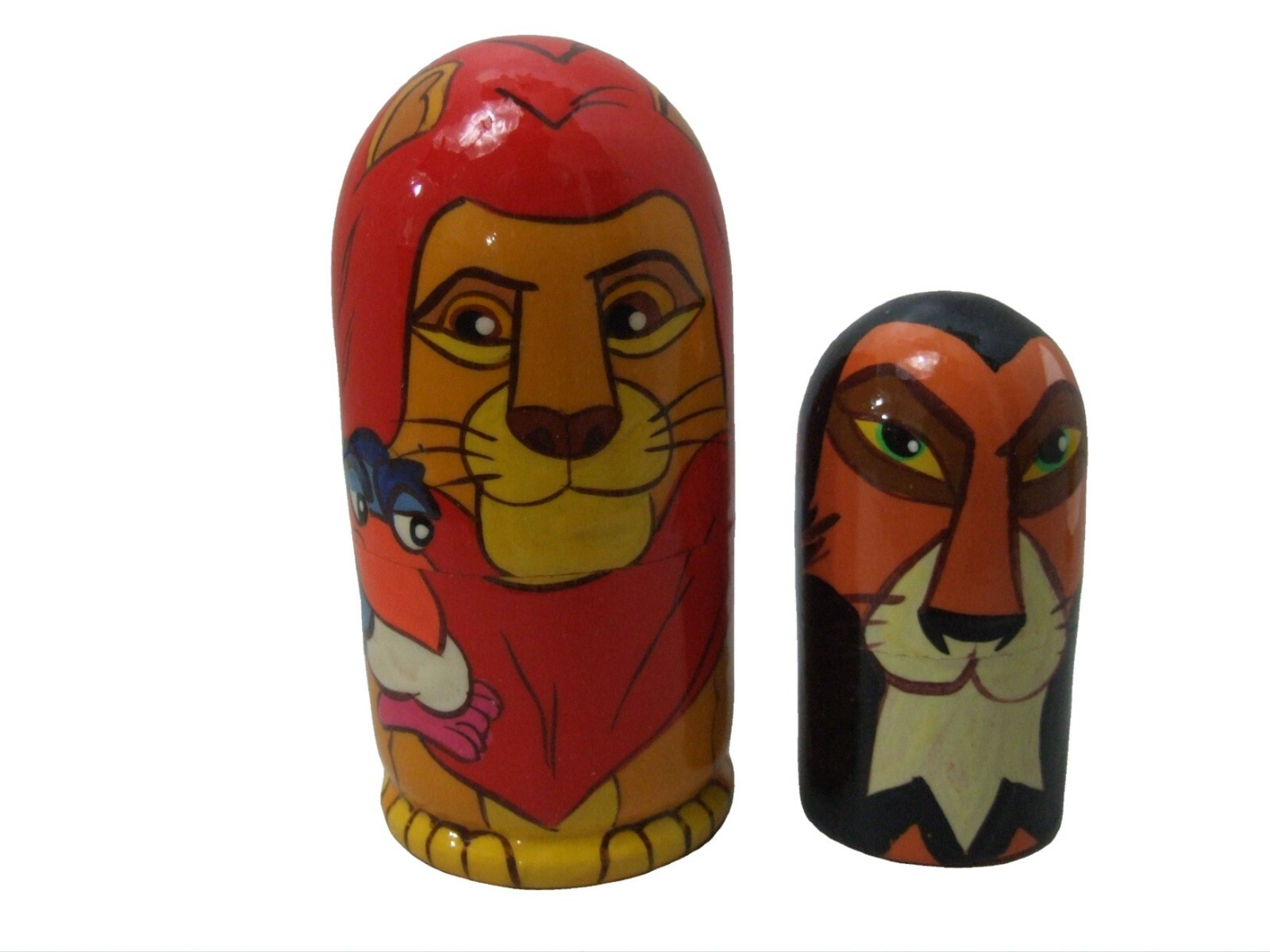 A 5pcs. Russian Nesting Doll of Lion King. The set is completely hand painted and handmade by a Russian artist. The set depicts the movie of Lion King characters the set is made from wood, then hand painted, and lacquered by the artist. The size of the set is 4.25 inches tall (11 cm). Made in Russia