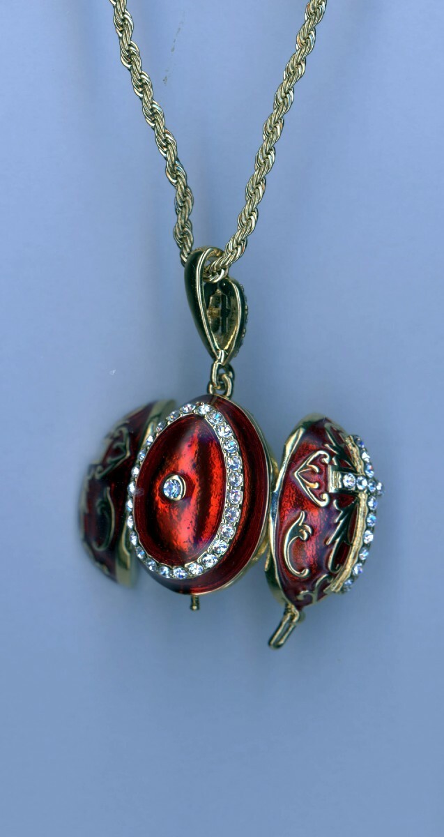 Una bella croce in rosso, progettata da un ciondolo di uova russo reale con collana da 20 pollici
