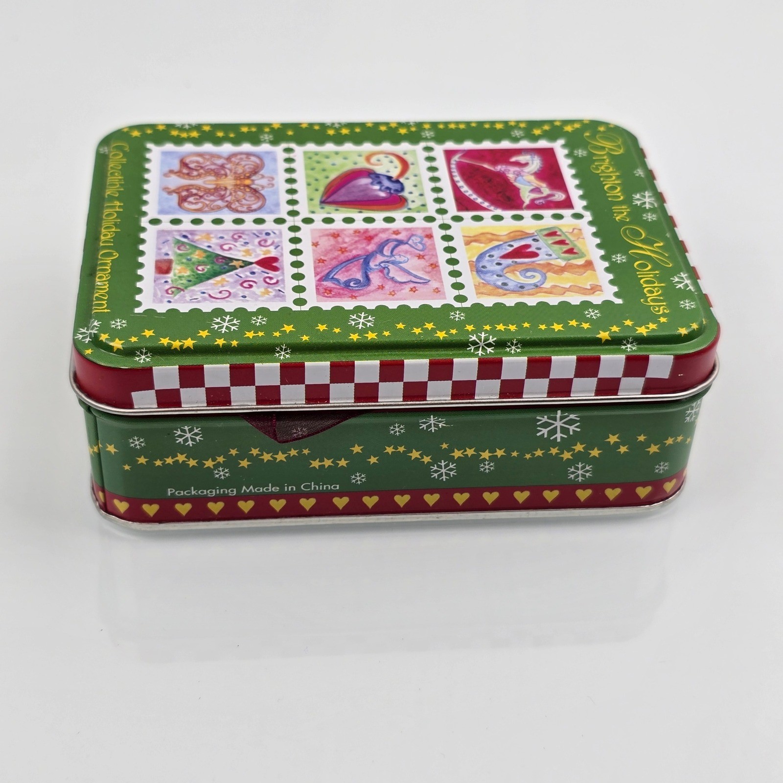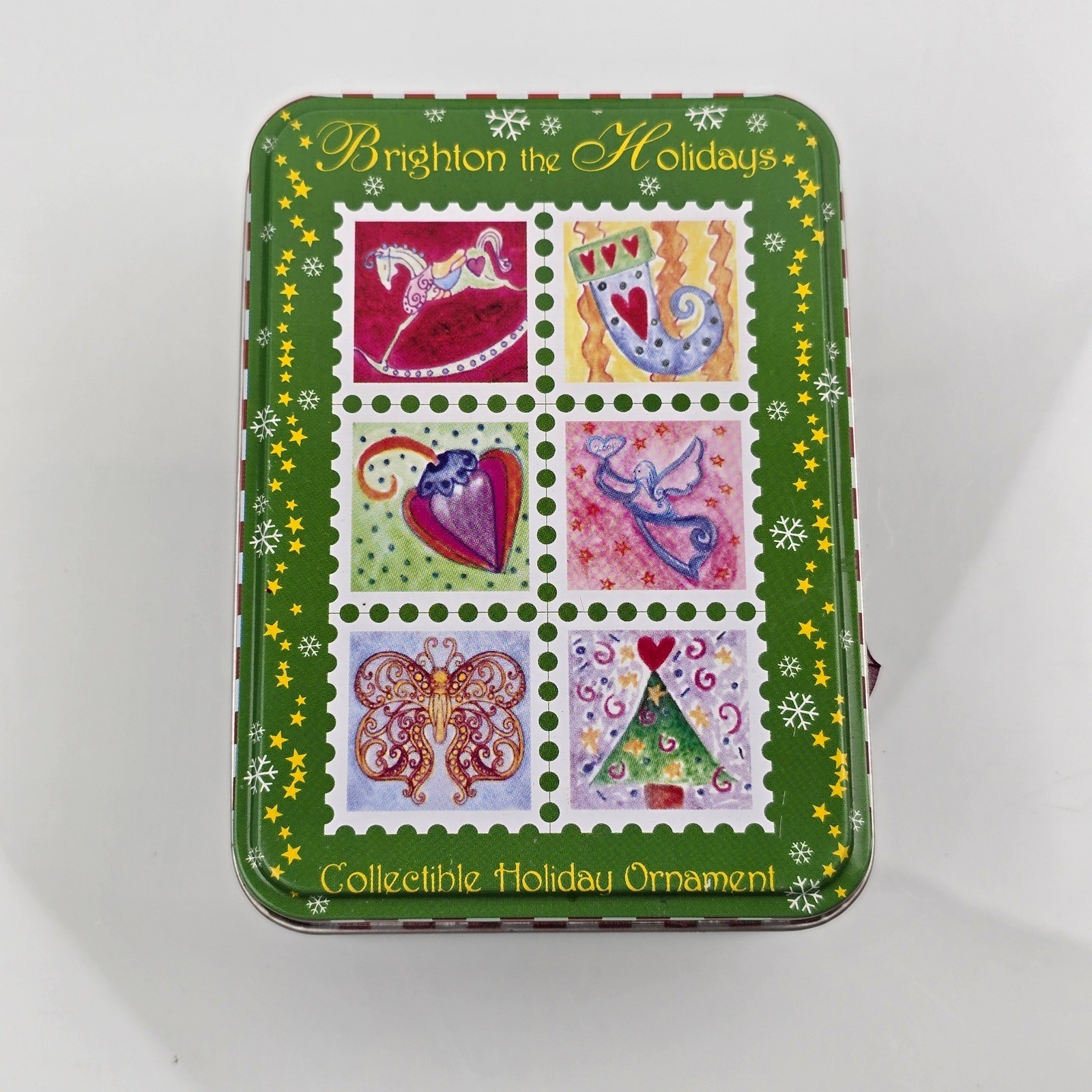 Evoke the enchantment of Christmas with this delightful Brighton collectible ornament. Showcasing intricate detailing and a festive theme, it brings a touch of elegance and holiday cheer to any space. This ornament comes nestled in a decorative tin featuring charming holiday-themed postage stamp designs. The tin itself is adorned with festive colors and patterns, adding to its appeal as a keepsake. Perfect for adorning your Christmas tree, enhancing your holiday table setting, or presenting as a thoughtful gift, this ornament and tin set brings holiday spirit to your home decor.