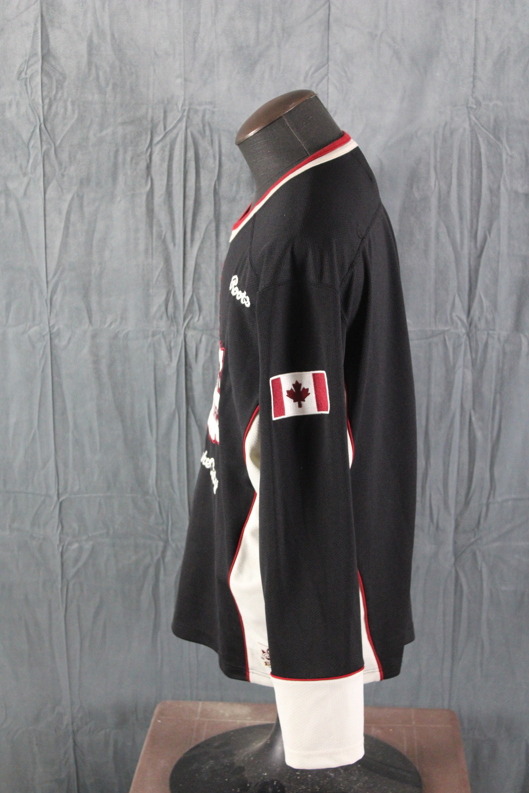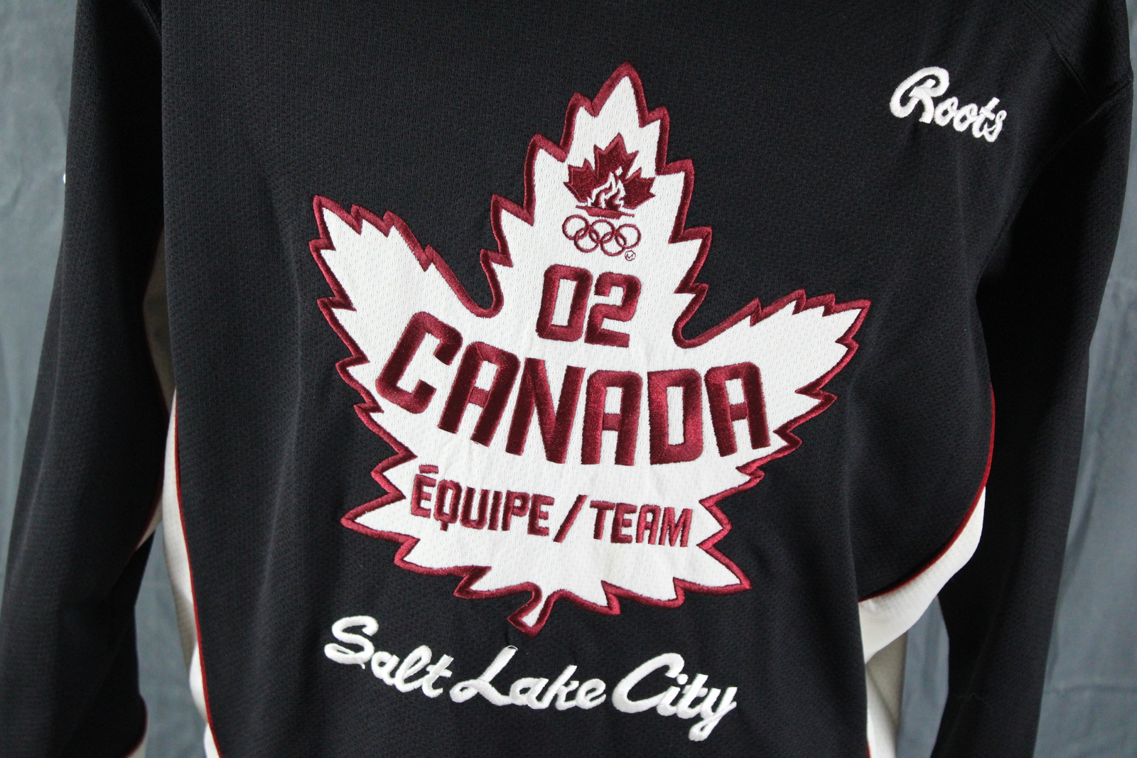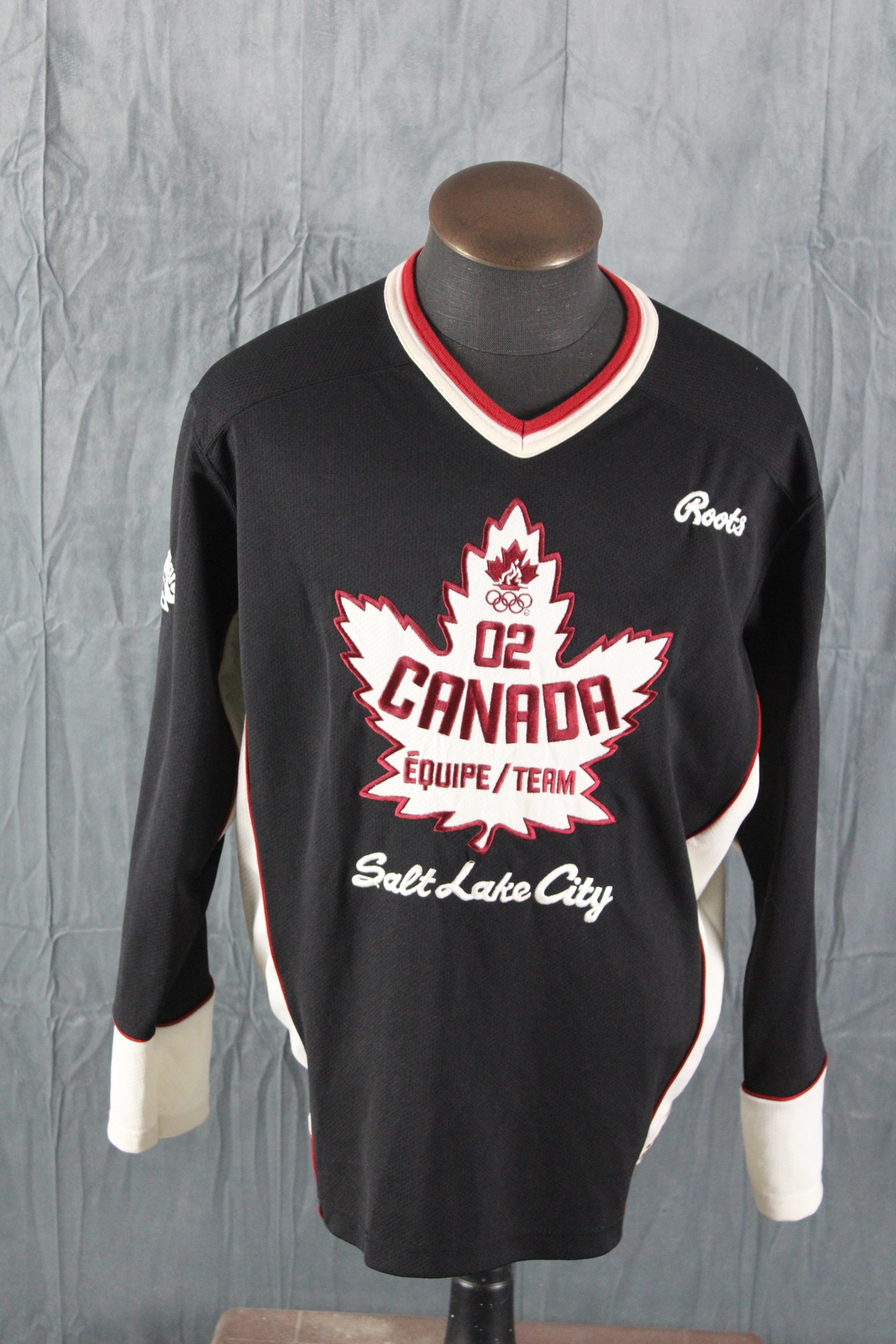 Up for sale is a Team Canada Olympic jersey from the 2002 Winter Olympic Games. It has a black base colour with red and white trim. The front of the jersey has a white maple leaf crested on with Salt Lake City underneath. One sleeve has a Canadian flag crested on while the other sleeve has Roots stitched in. What a great jersey do not miss out on it.