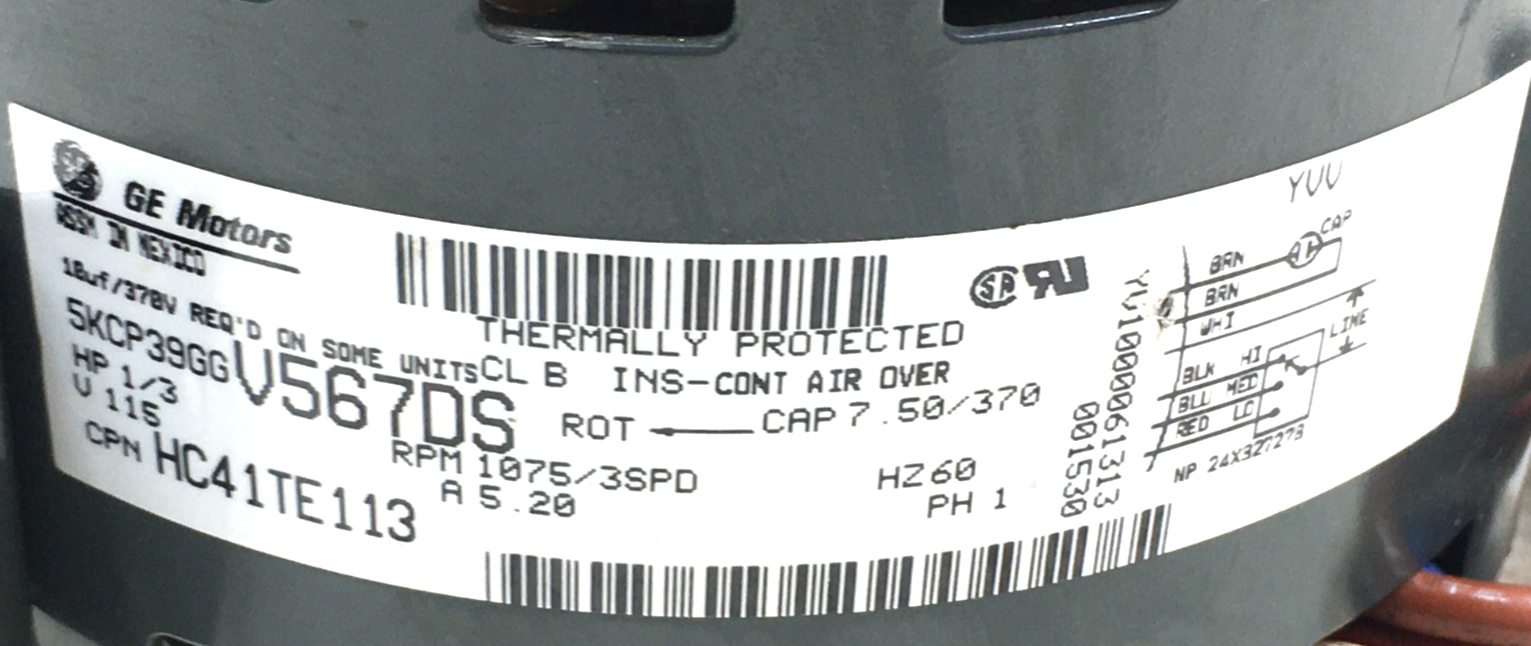 This is GE Motors 5KCP39GGV567DS Blower Motor 1/3HP 1075RPM 3SPD 115V HC41TE113 used part.