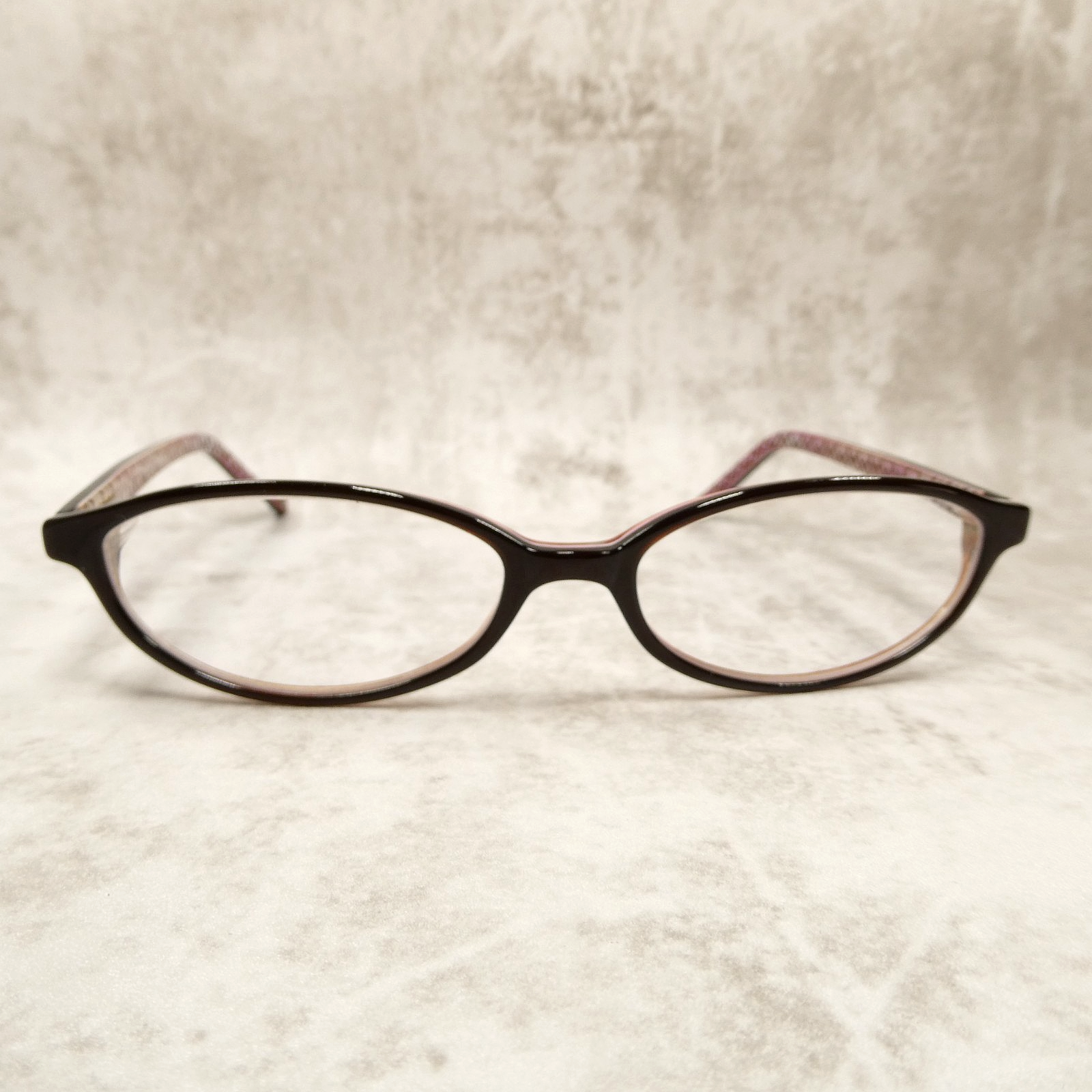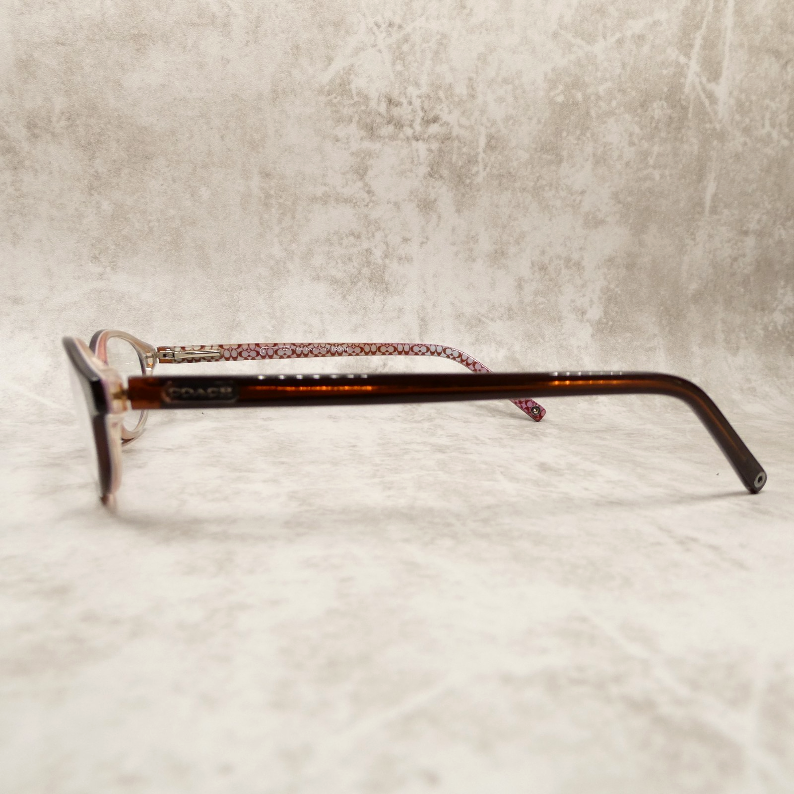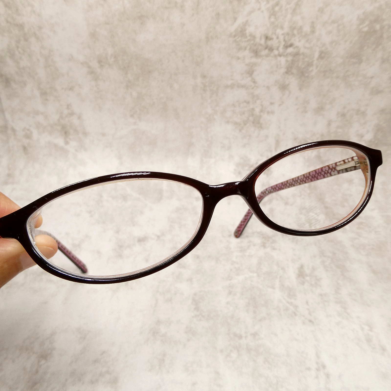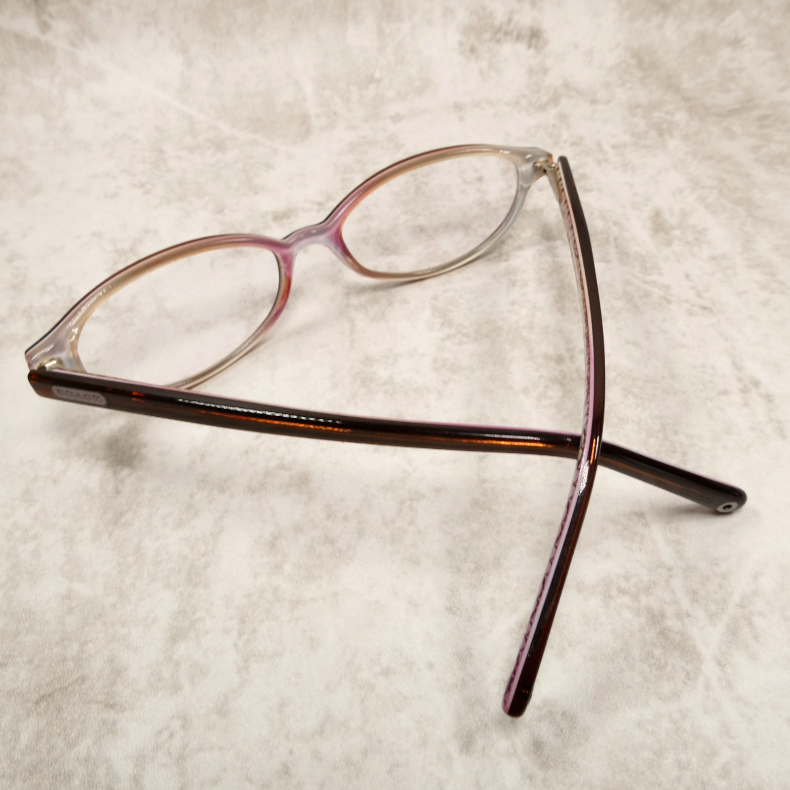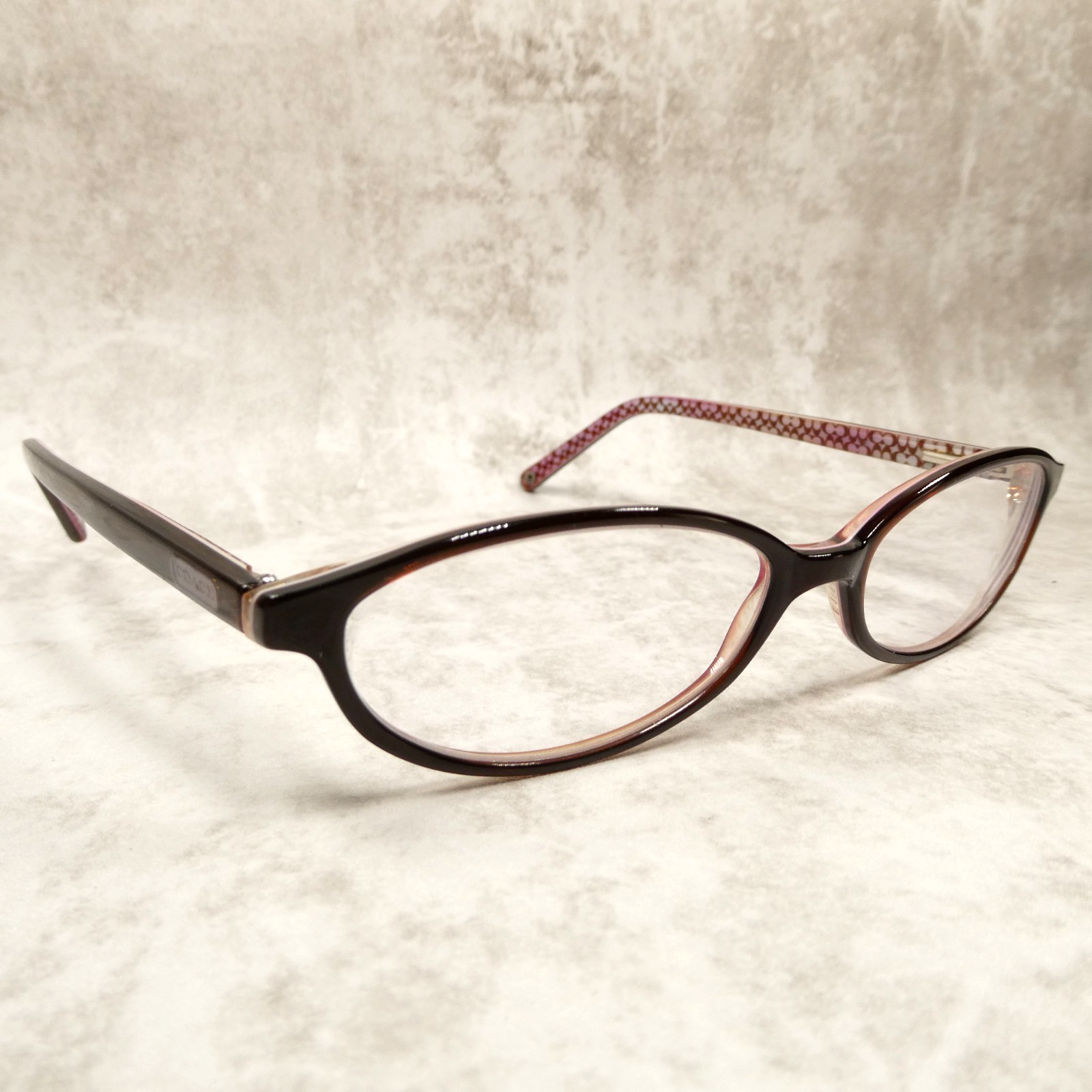 Coach high-gloss brown/burgundy acetate eyeglasses with matching arms.