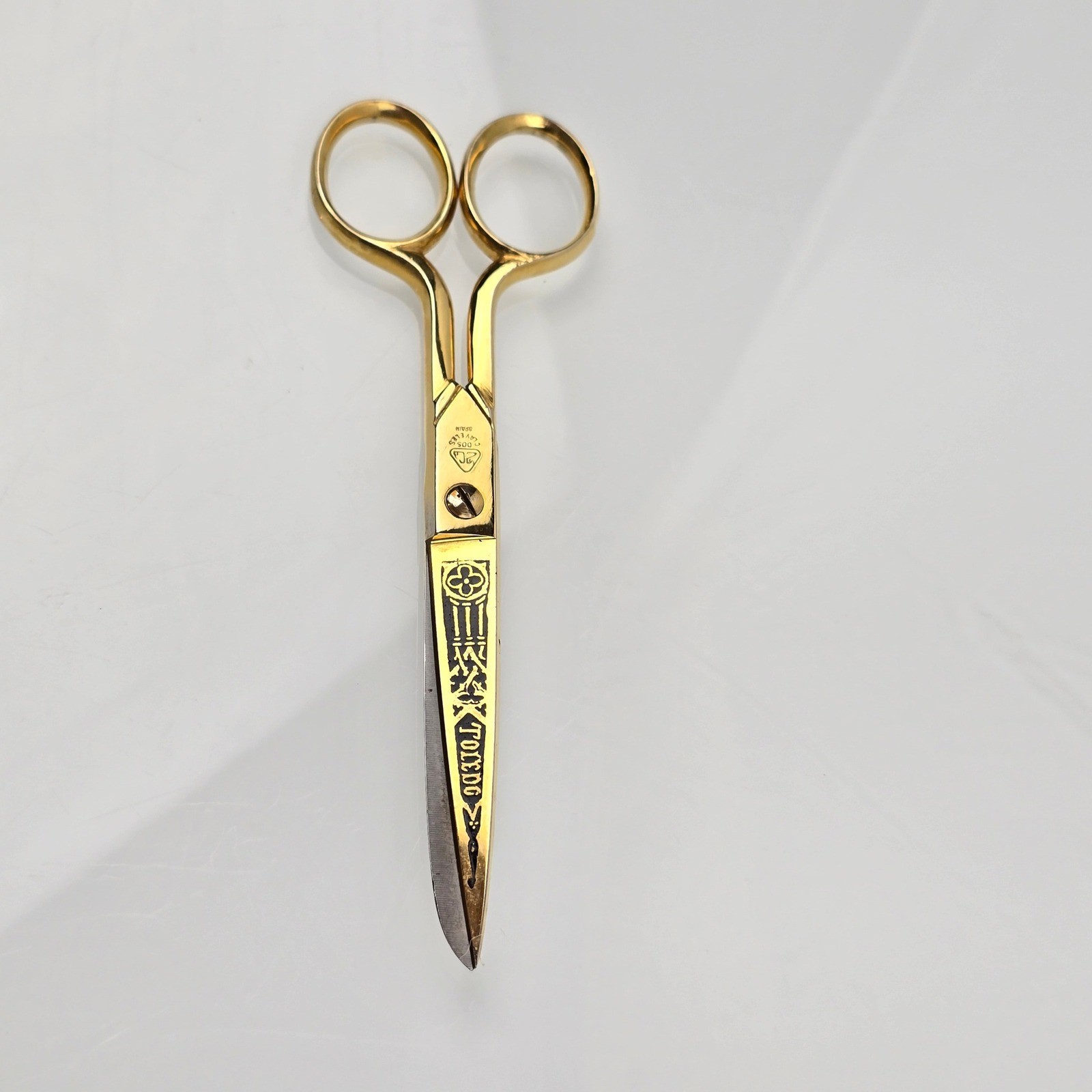 Keywords: 2 Claveles, Toledo, Spain, scissors, shears, gold, etched, vintage, craft, sewing, grooming, 6 inch, new old stock, NOS