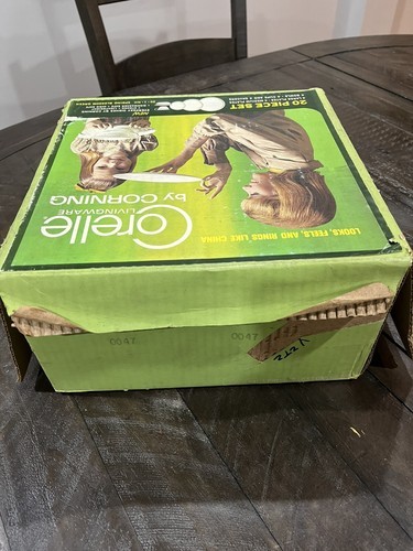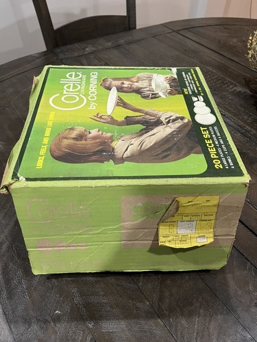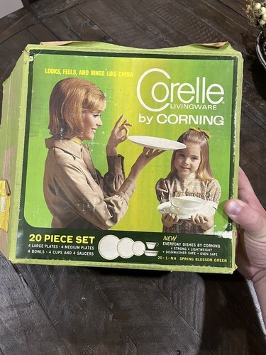 A vintage Corelle Livingware 20-piece set in the Spring Blossom Green pattern, complete with its original box. This set includes four large plates, four medium plates, four bowls, and four cups with four saucers, perfect for a small family or intimate gatherings. The Corelle Livingware line is known for its durability, lightweight design, and resistance to chipping and breaking, making it ideal for everyday use. The Spring Blossom Green pattern adds a touch of retro charm to any table setting. This set is great for everyday meals, casual get-togethers, or adding a vintage touch to your dining experience.