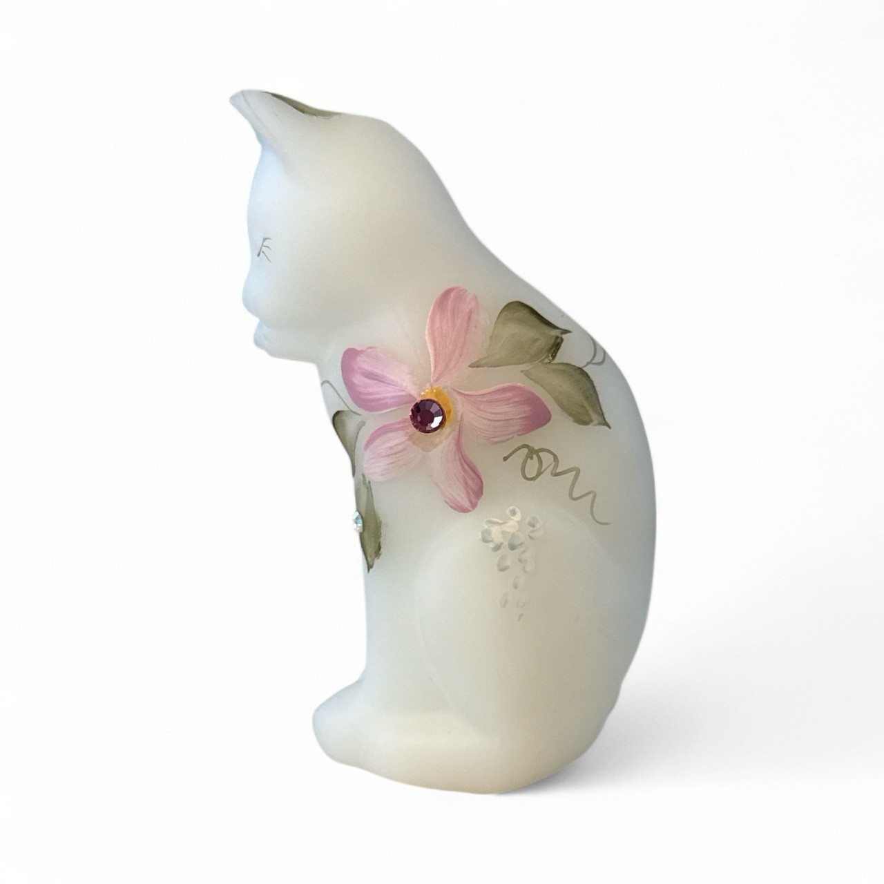Fenton Milk Glass Grooming Kitty Floral Handpainted/Signed Rhinestone Satin Vtg