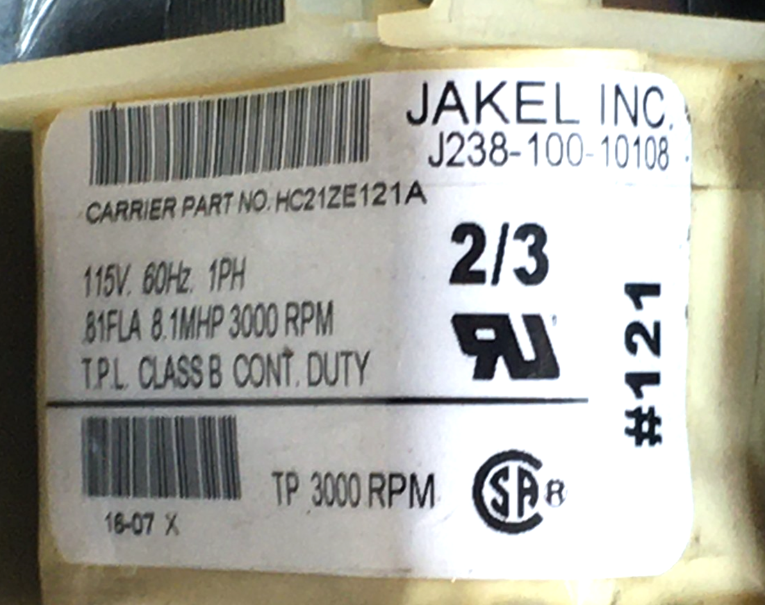 This is JAKEL J238-100-10108 Draft Inducer Blower Motor HC21ZE121A 115V 3000 RPM used previously, refurbished part, excellent working condition.