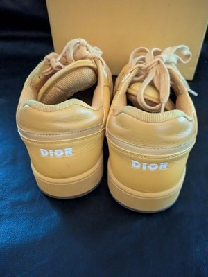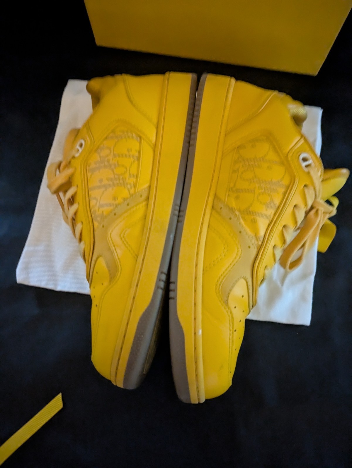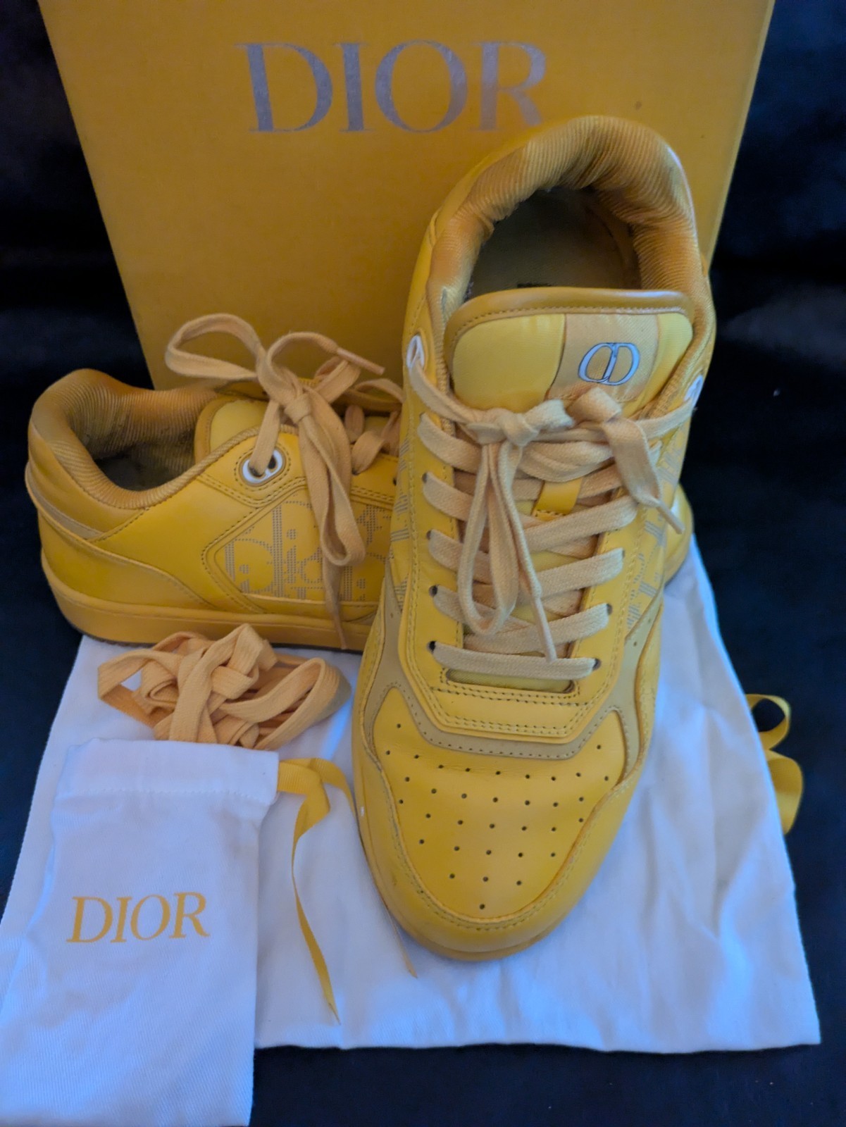 The Dior B27 LT Calf Galaxy Low Top World Tour Yellow Box sneakers in EU 42 US 9 are a stylish and athletic option for men. Featuring a low top design with a lace-up closure, these sneakers are made of leather with a vibrant yellow color. The Dior branding and unique design make them a trendy choice for casual occasions, embodying the brand's luxury and fashion sense. Made in Italy, they are a part of the Dior B27 line and showcase a world tour theme in their design, making them a statement piece for any sneaker collection.