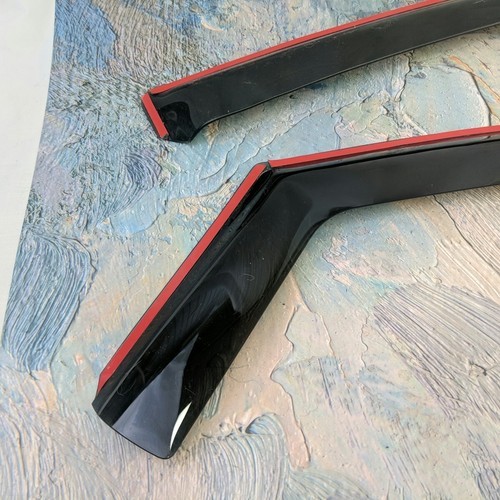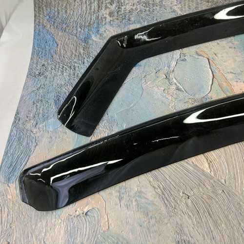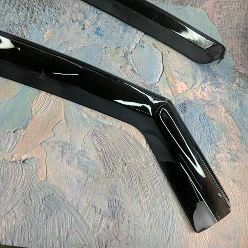 The Rough Country 811924 Side Window Deflectors are a set of two black plastic shades designed for the front windows of a 2019-2024 1500/2500HD vehicle. These custom-fit shades feature a gloss finish and self-adhesive attachment for easy installation. They provide sun protection, allow airflow, and are designed to enhance the vehicle's performance without compromising visibility. Manufactured in the United States, these deflectors are a practical addition to your car or truck for added comfort and style.