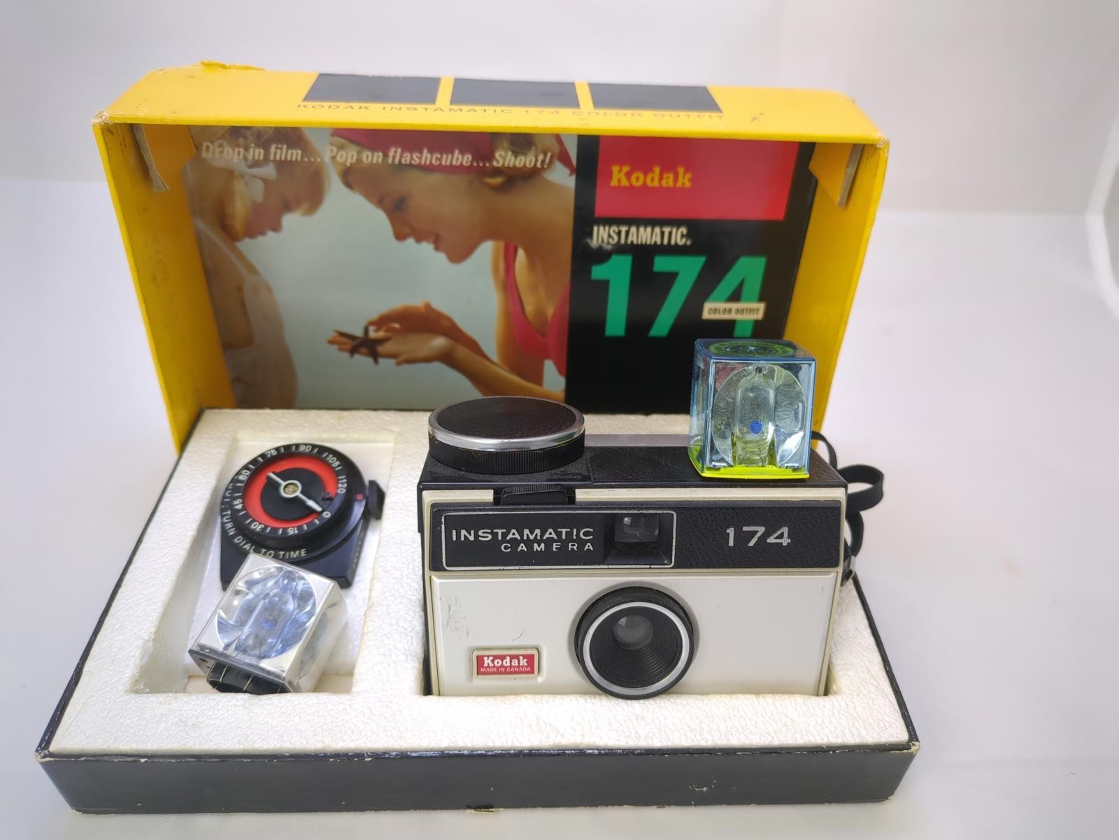 This listing features a vintage Kodak Brownie Super 27 camera along with two Kodak Instamatic cameras, including the Kodak Instamatic 174 and 134 models.