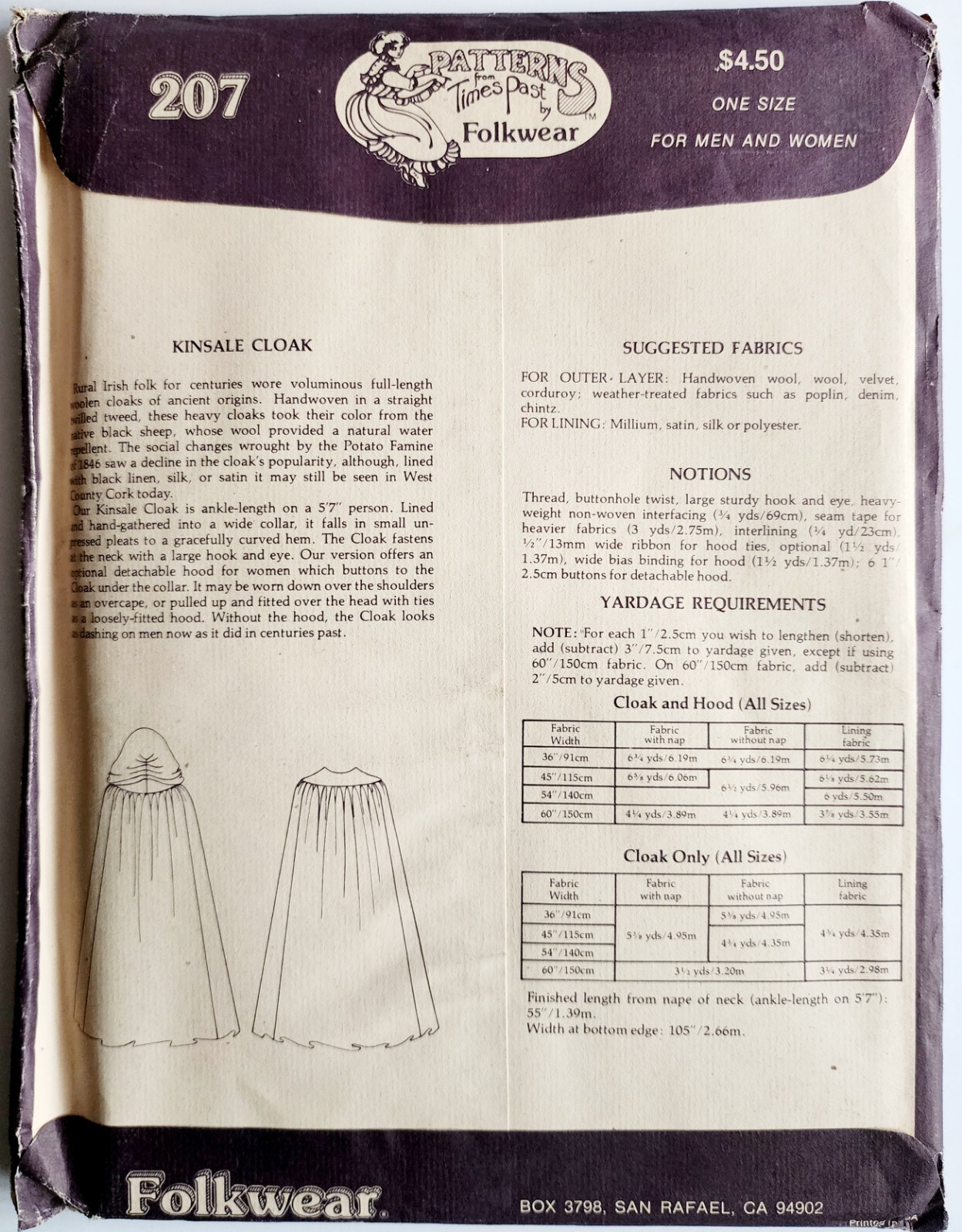 1979 Folkwear 207 Kinsale Cloak Pattern Cape Historical Costume Sealed Vtg E52