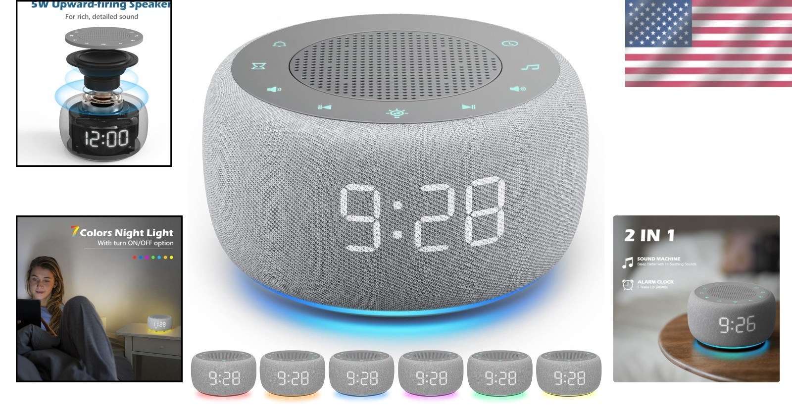 Compact 2-in-1 Sound Machine Alarm Clock - 7 Night Light Colors 18 Sounds