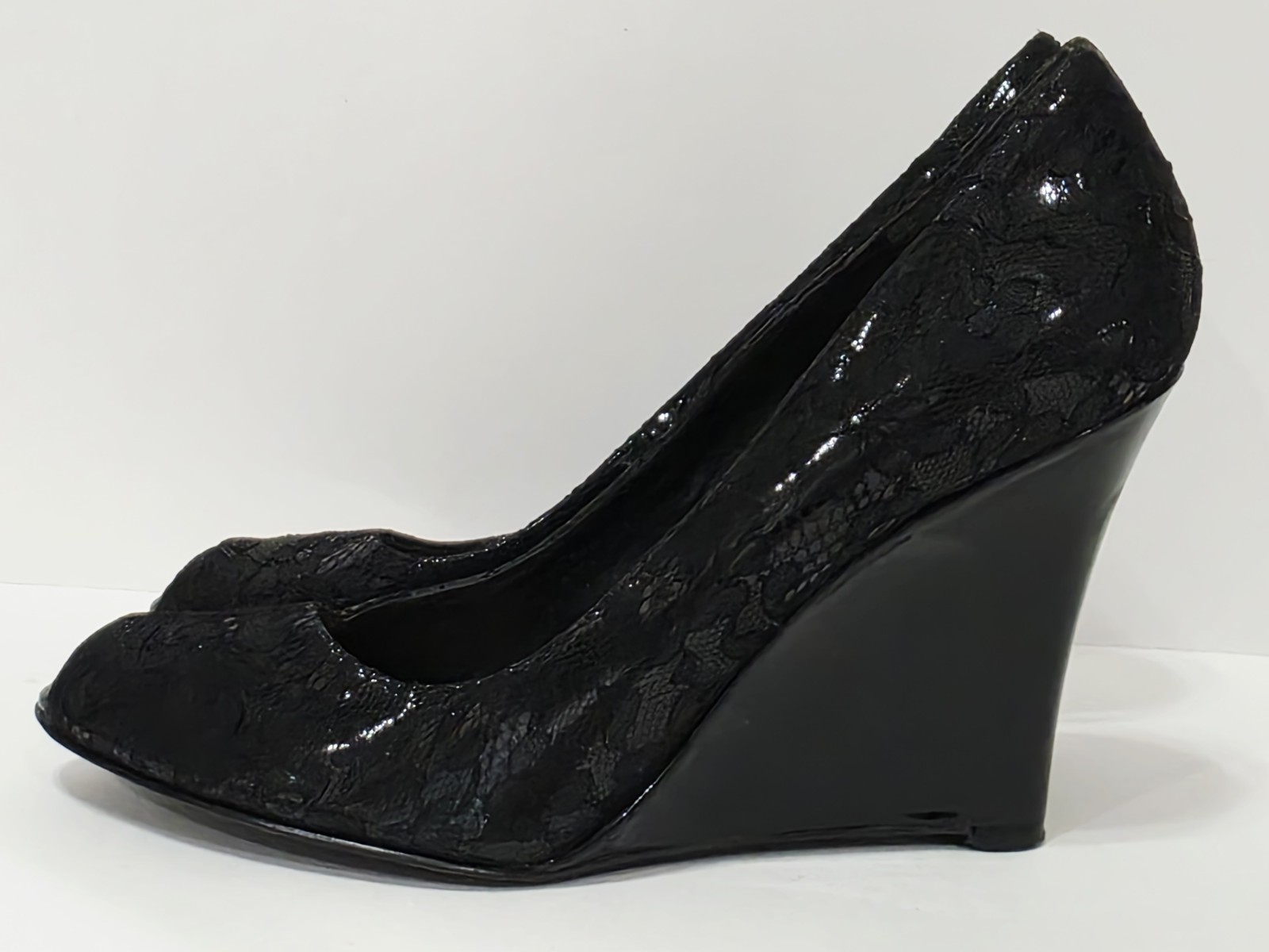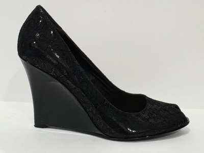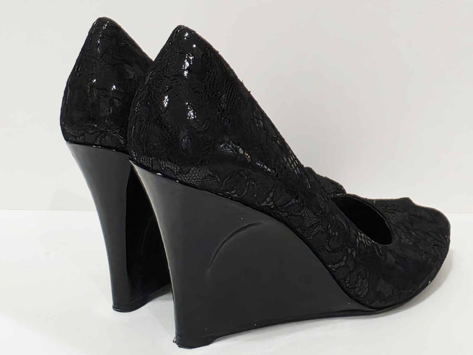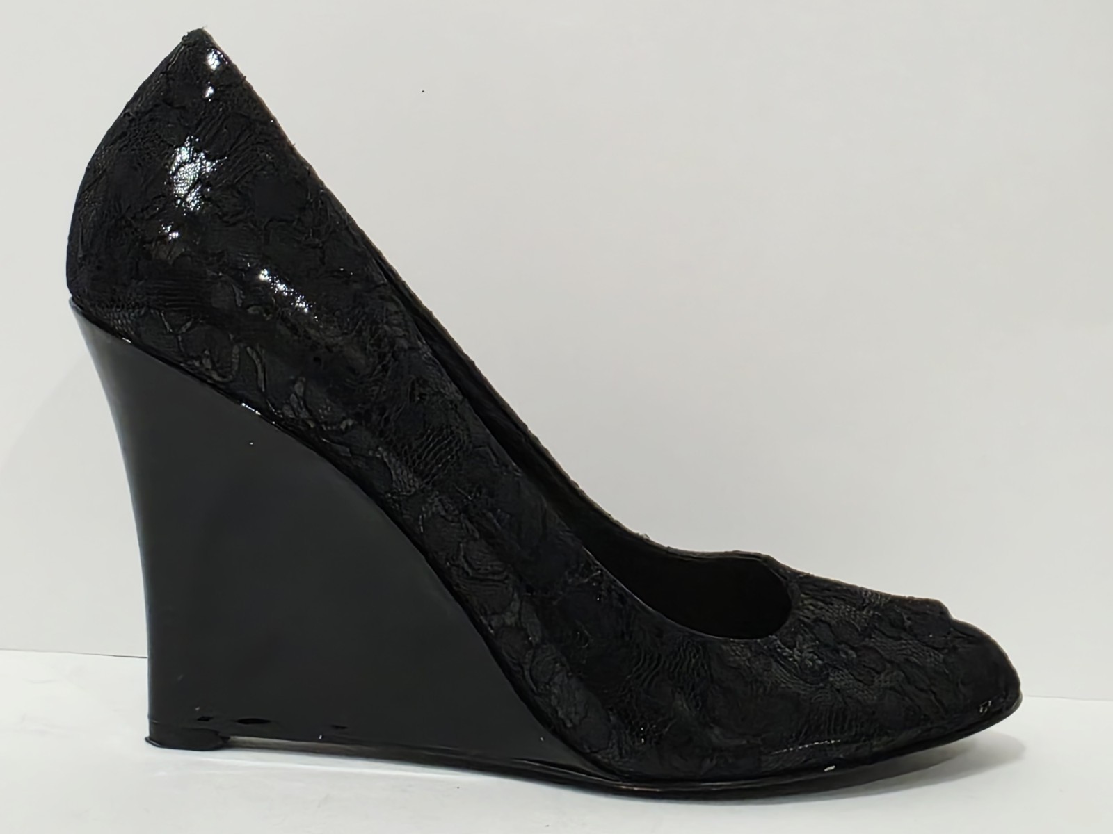 1 Used Pair No Box By Thakoon for Nine West BLACK LACE Patent Leather Wedge Loafer Heel Pump Peep Toe 7.5 M Used! (Box #17)