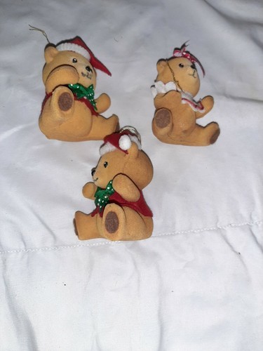 Vintage FLOCKED Christmas Ornaments TEDDY BEARS lot of 3