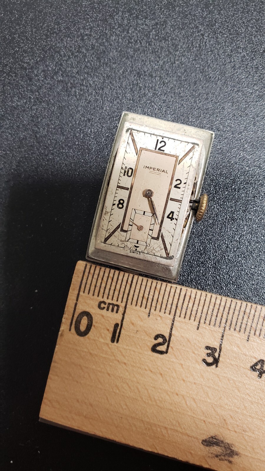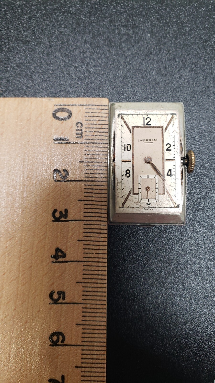 Vintage 50's 60's Imperial Rectangle Watch White case Gold Dial Subdial / tank style see condition above. I am not an expert on these. We got a huge supply off a watch maker that went out of business years ago. This is nice watch here. Not sure where the rest of this is. But hopefully you can use this!!!! This should be good lot for watch maker / repairer. this may need to be cleaned up, but does not have scuffs or scratches Please check out my other vintage watch parts and crystal. we have lots of them and more to list. I will give deals on multi-orders!!!! FREE SHIP IN USA