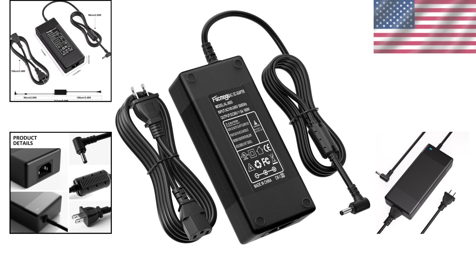Compatible with 36V DC equipment. Ensure that your electronic device's output voltage is 36V and the output current is ? 5A, with a rated power within 180W.