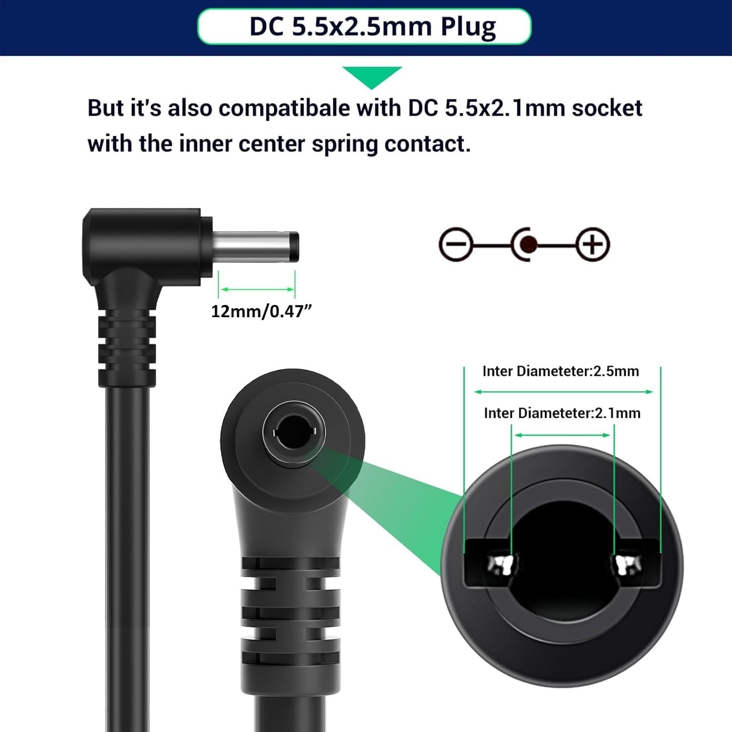 Fits both 5.5x2.5mm 5.5x2.1mm plugs.
