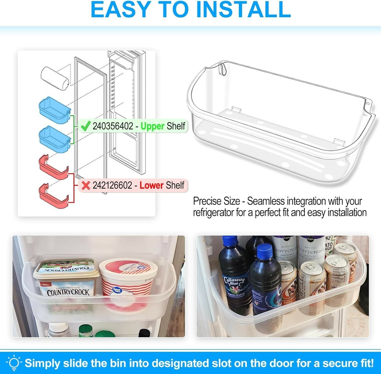 Notice - Before Purchase: Only fits top 2 shelves of side-by-side refrigerator models. Maximum Length: 15.38", Front Height: 5", Depth: 6.65". NOT compatible with models 240324502, 240363702, 216959802, 241505501, 241505301. Please check your refrigerator door shelf size carefully before purchasing.