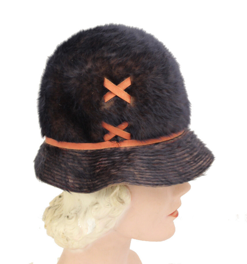 VTG 1960's Miss Carnegie / Hattie Carnegie MOD Bucket Hat Brown Fur Rust S/M