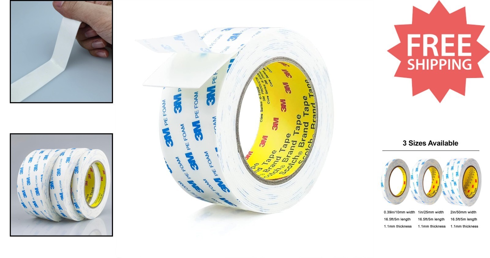 Discover the versatility of our 3M Series 1600T PE Foam Double-Sided Tape, designed for reliable, high-performance bonding. Measuring 2 inches (50mm) in width, with a length of 16.5 feet and a thickness of 1.1mm, it offers excellent adhesion with high temperature resistance and waterproof features. Its robust 90 peel adhesion (11 lb/in or 19 N/cm), tensile strength (49 lb/in), and overlap shear strength (78 lb/in on aluminum) make it ideal for various applications including mounting photos, posters, logos, carpets, and even car decorations. Easy to use and capable of replacing mechanical fasteners, this heavy-duty tape ensures a smooth, virtually invisible finish. For optimal results, clean surfaces thoroughly and allow 24 hours for full bonding strength. To ensure fast and reliable delivery, we work with multiple fulfillment partners and suppliers. Depending on availability and location, your order may ship from different warehouses or arrive in packaging that varies from item to item. Tracking details are typically provided shortly after shipment, and customer satisfaction remains our top priority. Please note that due to carrier policies and regional regulations, certain items may not be eligible for delivery to specific states or territories.