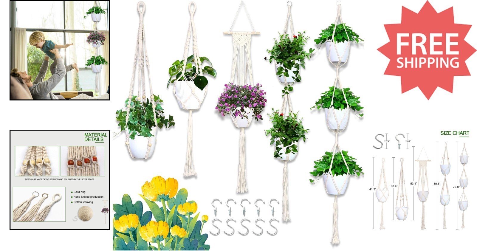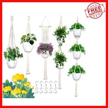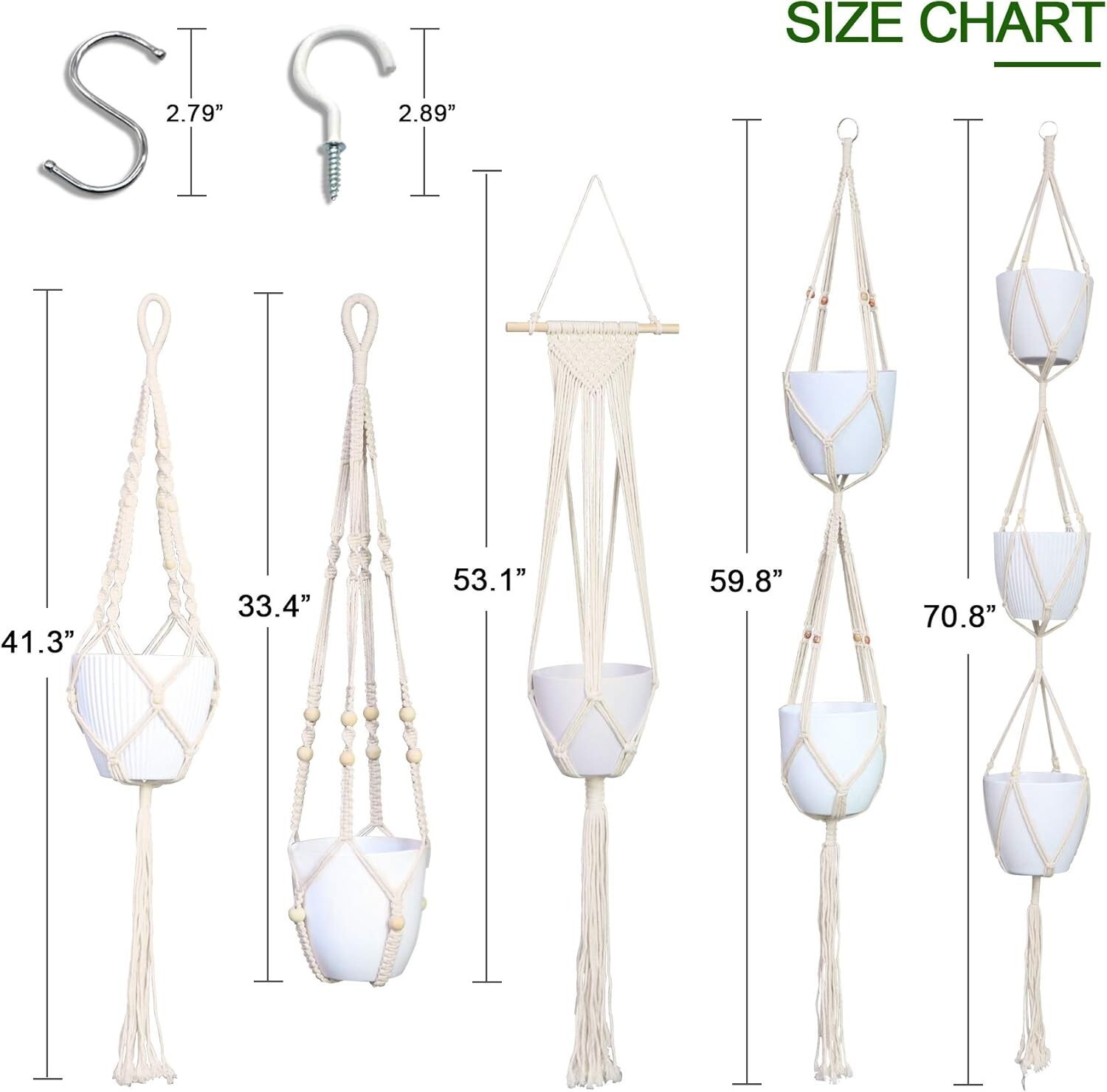 Elevate your indoor greenery with our handcrafted macrame plant hanger set, made from high-quality, all-natural pure cotton cords. Designed to fit planters from 4.7 to 8 inches in width, these stylish hangers add a unique, bohemian touch to any space. The kit includes 5 differently styled hangers, each approximately 33.4 to 70.8 inches long, along with 5 ceiling hooks and S hooks for easy installation.