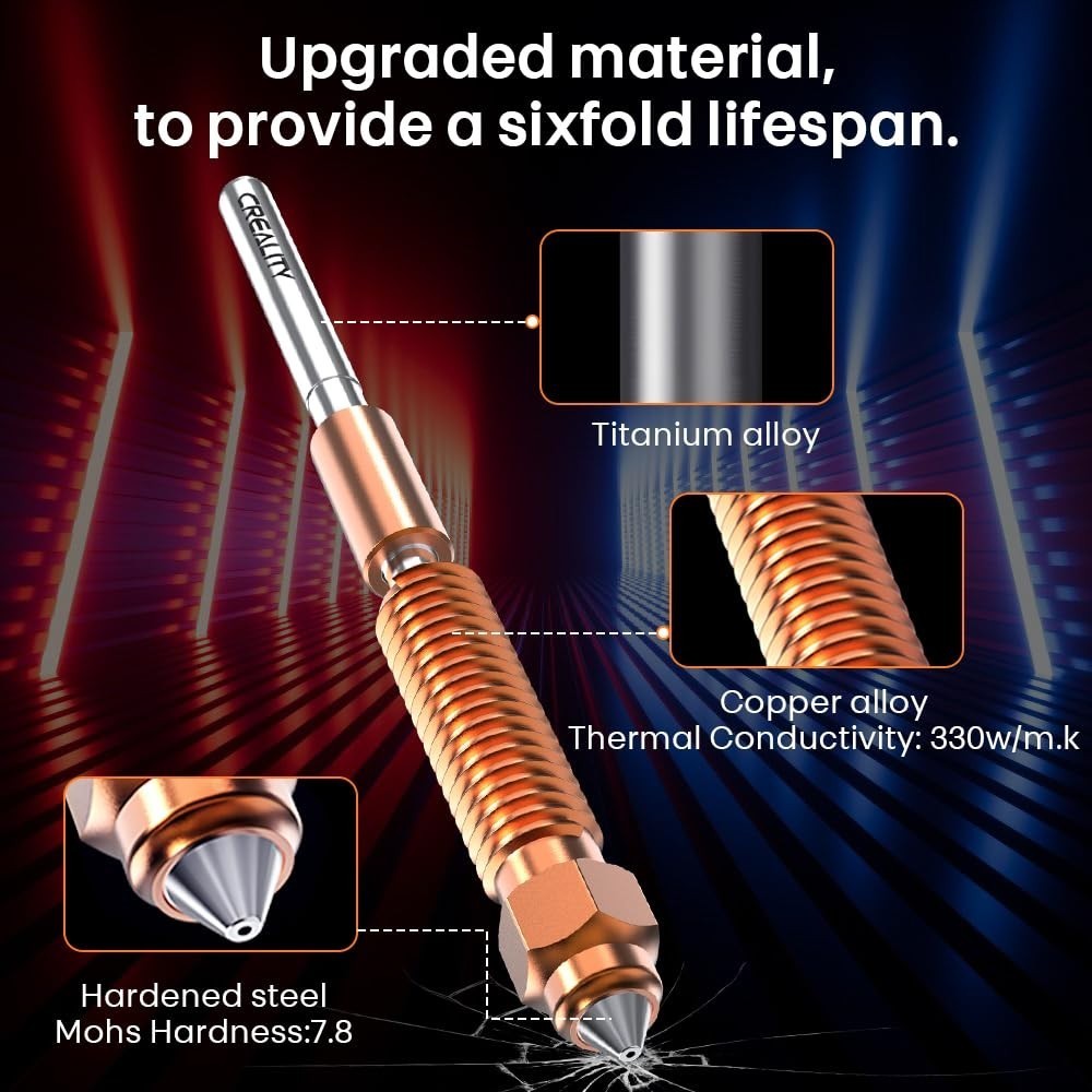 Quick-Swap Nozzle Kit: Enjoy rapid assembly and disassembly with an all-metal integrated design that minimizes heat conduction. The nozzle, crafted from copper alloy and hardened steel, accommodates a diverse range of filaments.