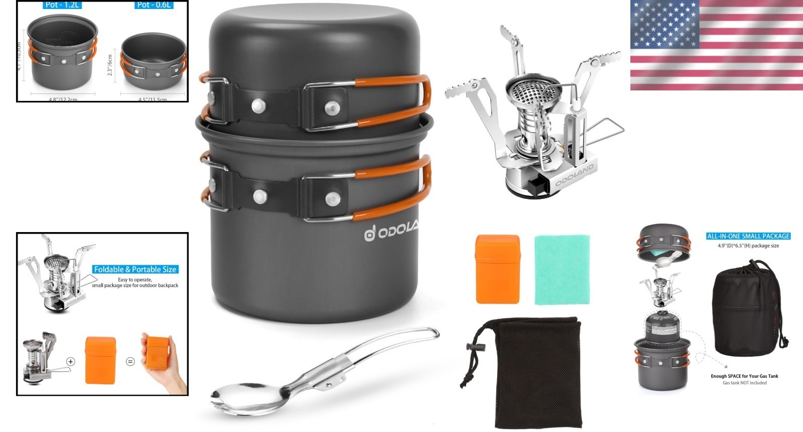 Includes: 2 aluminum non-stick pots, 1 camping stove, 1 spork, 1 cleaning cloth, and 1 carry bag.