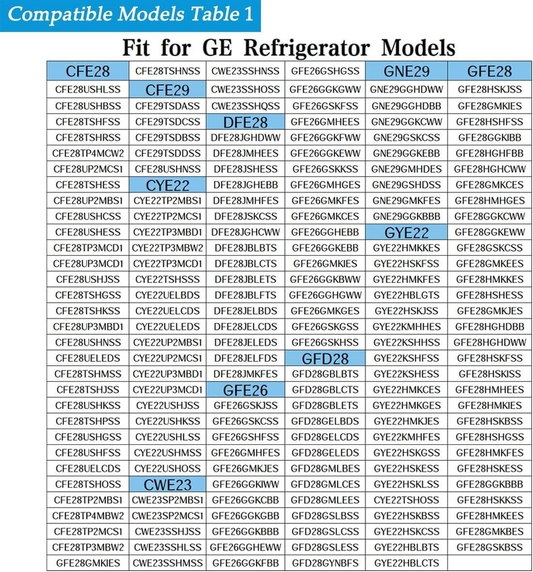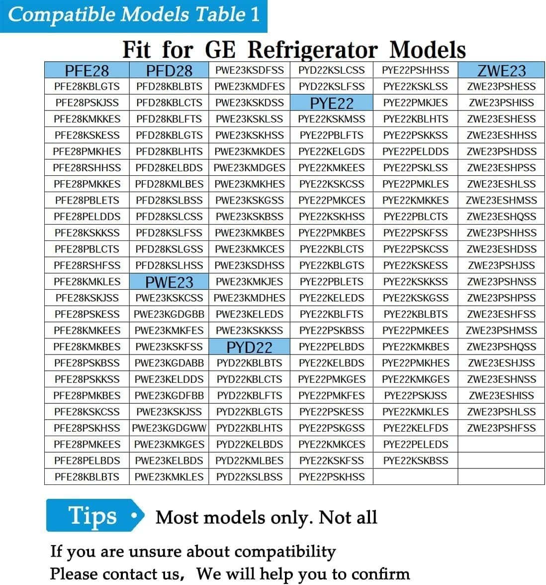 Compatibility: Please verify your refrigerator model. Compatible models include CFE28, CFE29, CWE23, CYE22, CYE23, DFE28, DFE29, GFD28, GFE26, GFE27, GFE28, GFE29, GFS26, GFS28, GNE26, GNE29, GYE22, GYS22, PFD28, PFE28, PFE29, PWE23, PYD22, PYE22, PYE23, ZWE23, and more.