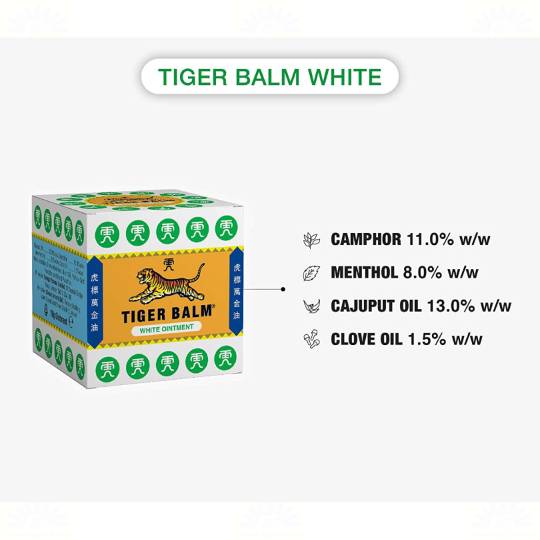 Tiger Balm White can be used by adults only. Rubbing the balm on the forehead or temples to soothe headache. It is an external preparation for the relief of bodily aches and pains of muscle and joints due to backache, arthritis, strains and sprains. It can also be used to relieve tension headaches and the itch of insect bites. Cajuput Oil and Clove Oil act as mild counter irritants which cause the tiny capillaries, in and around the muscle tissue, to dilate and increase blood flow which eases pain by draining the lactic acid away from the muscles. Menthol and Camphor acts as an analgesic and a gentle stimulant that soothes the area with aroma therapeutic qualities. Our customer service representative works on 24/7 basis. Your satisfaction is of utmost importance to us. Always feel free to