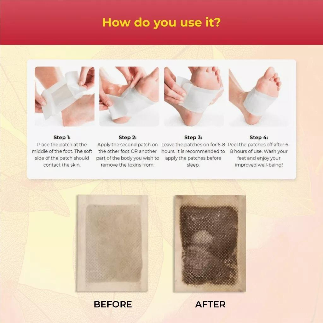 Apply the foot patch on the sole of the feet before sleeping and remove it off the next day morning after waking up. (around 6-8 hours later) The colour of the foot patch will change from white to brown.