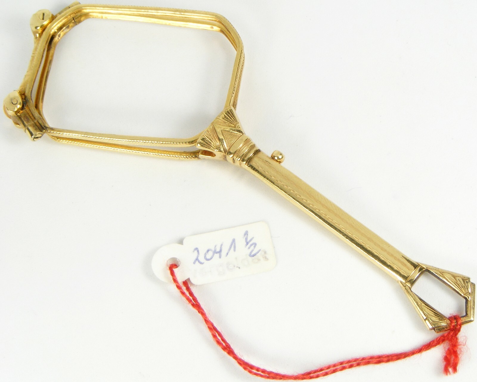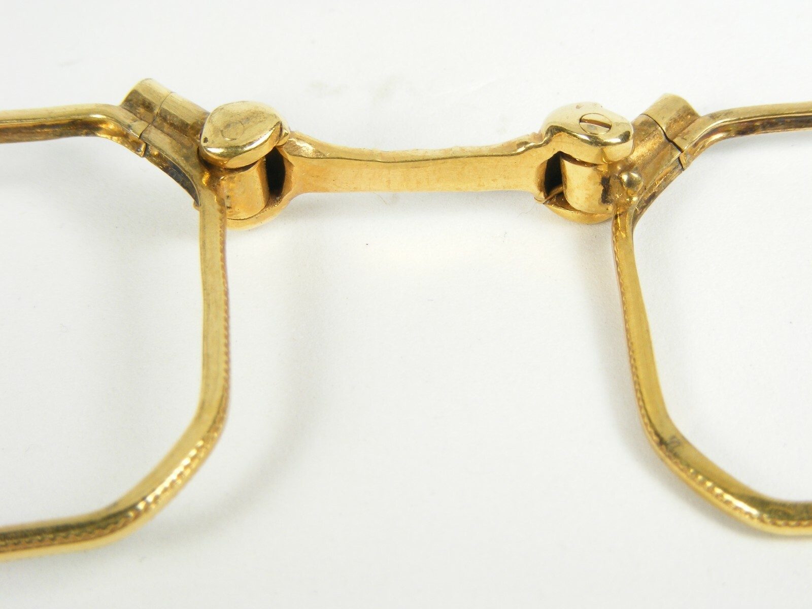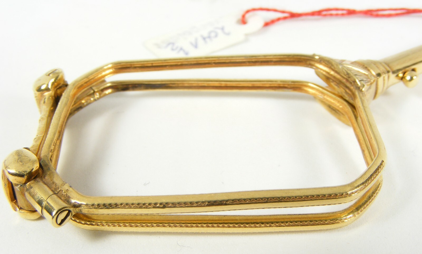 Dies ist wirklich ein toll aussehendes Vintage -Faltbrunnen. Die Nasenbrücke zwischen den Objektiven ist dekorativ sowie die Verarbeitung am Griff. Die Brille faltet sich ein und hat einen Freigabetaste am Griff. Bitte beachten Sie, dass es in diesem Stück keine Glasobjektive gibt. Dies ist eine großartige Faltbrille, um eine Sammlung zu besitzen, zu verwenden oder zu erweitern.