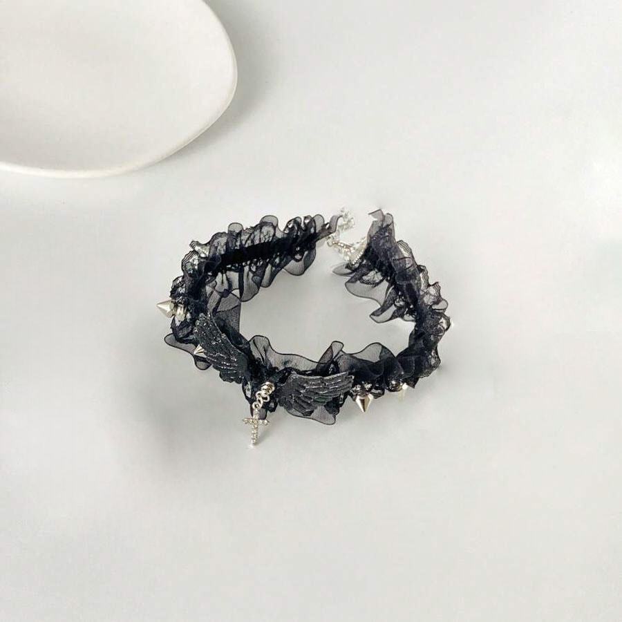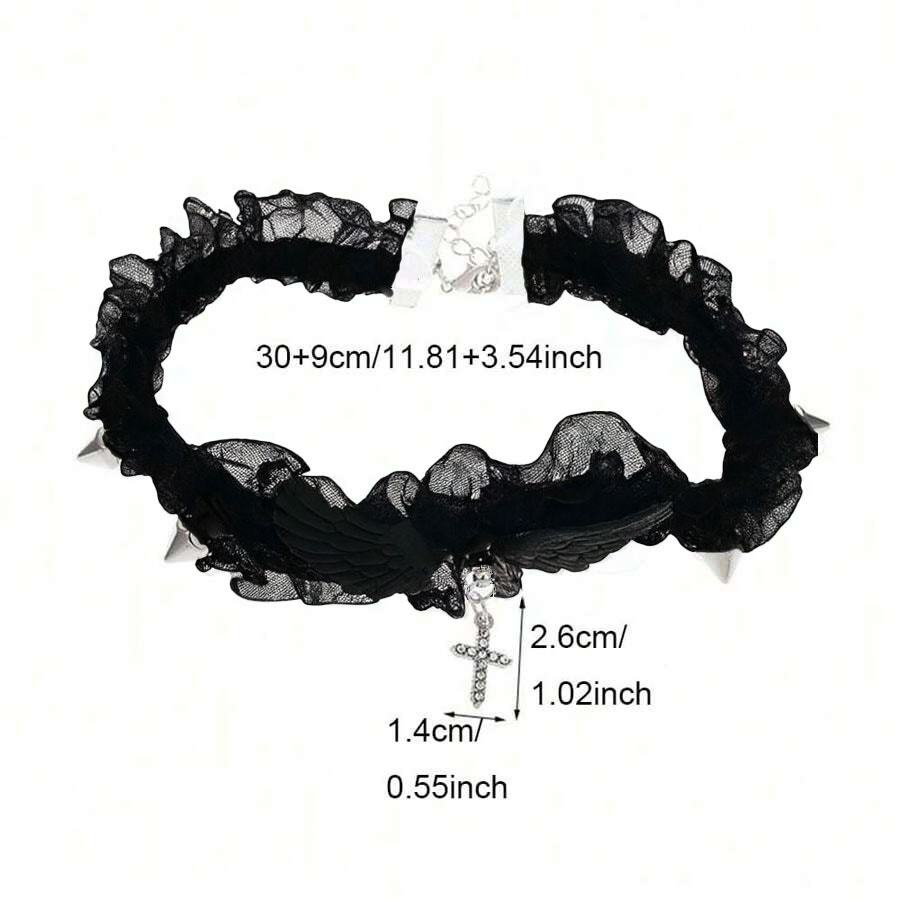 Angelic Gothic Style ? Features layered black lace ruffles adorned with angel wings, spikes, and a dangling cross pendant.