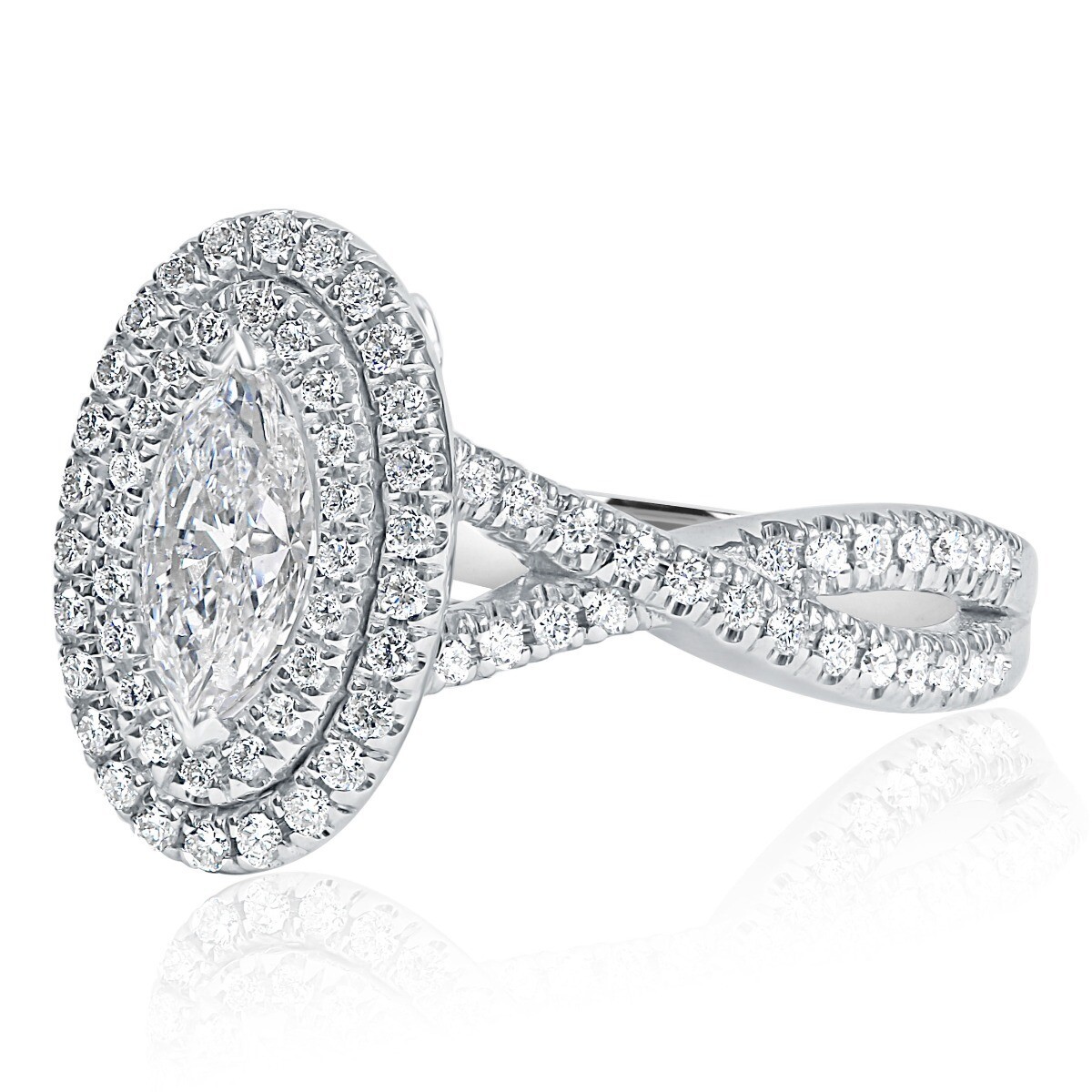 Dieser klassische elegante Verlobungsring zeigt einen 0,52 Karat Marquise Cut Natures Diamond Center -Stein, der von einem doppelten Halo glitzernder farbloser, runder Diamanten umgeben ist. Erstellt mit 14 Karat Weißgold mit verdrehtem Designband und mit einem hohen polnischen Finish abgeschlossen. Das Gesamtkaratgewicht betragt 1,00 Karat.