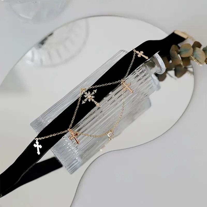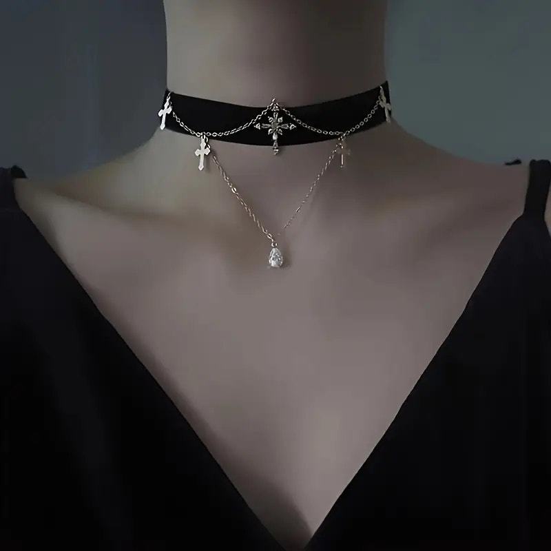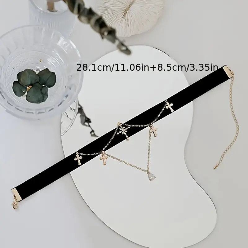 Channel your inner dark romance with this Gothic Cross Choker Necklace, featuring a soft black velvet band adorned with dangling gold cross charms and a delicate layered chain. A teardrop crystal pendant adds a hint of elegance, making this piece the perfect blend of edgy and ethereal. Whether you're dressing up for a night out or adding flair to your everyday style, this choker makes a bold statement.