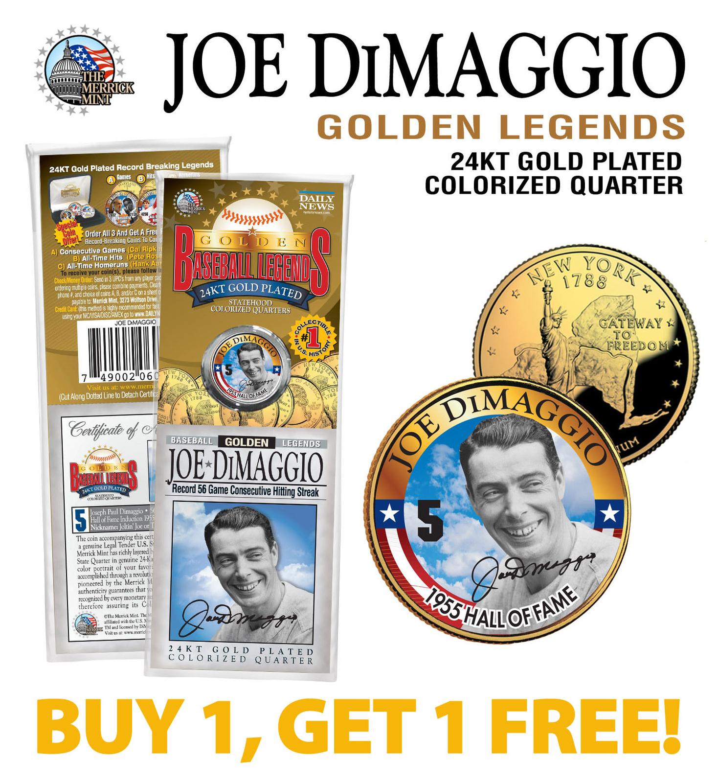 Buy one and get one FREE! This GOLDEN BASEBALL LEGENDS ? JOE DiMAGGIO ?1955 HALL OF FAME 5" coin is a treasured collectible, successfully combining baseball with coin collecting. Here is your opportunity to own or to gift, a beautifully colorized 2001 New York Quarter U.S. coin, which has been layered in Genuine 24 Karat Gold, and then enhanced with a beautiful colorized image by the Merrick Mint. This hard-to-find, cello-packed collectible was only available as a NY Daily News newspaper promotion. Each coin comes in a premium coin capsule with a Certificate of Authenticity to guaranty that your coin is authentic and recognized by every monetary authority around the world, assuring its Collector Edition status. This Legal Tender United States coin has been colorized with an application of special inks directly to the surface of the coin, using a unique and painstakingly multicolor coin process, which achieves a level of detail, color saturation, and durability that is #1 in the coin industry. The result is an everlasting colorized coin collectible of ultra-high quality. Each Statehood Quarter coin features an emblematic design of the state on the reverse and colorized player image on the obverse (portrait of George Washington design).