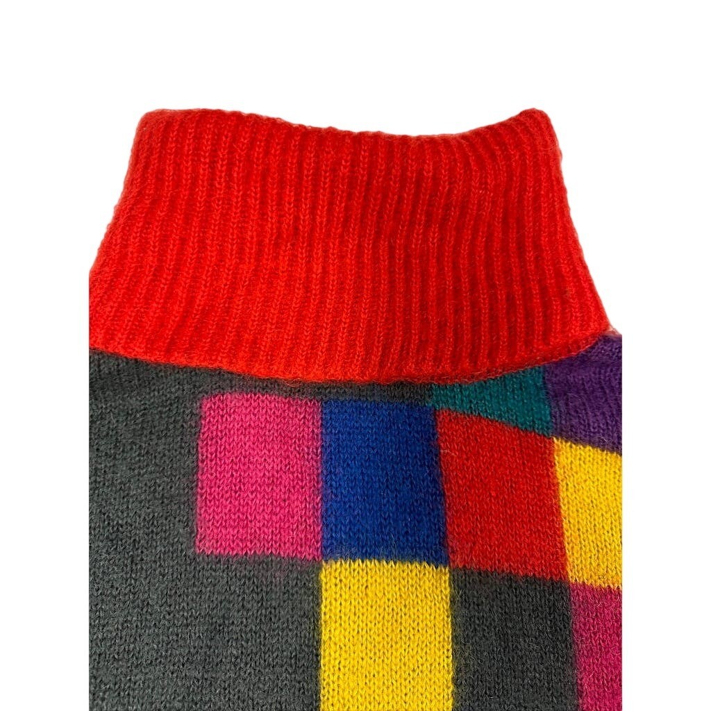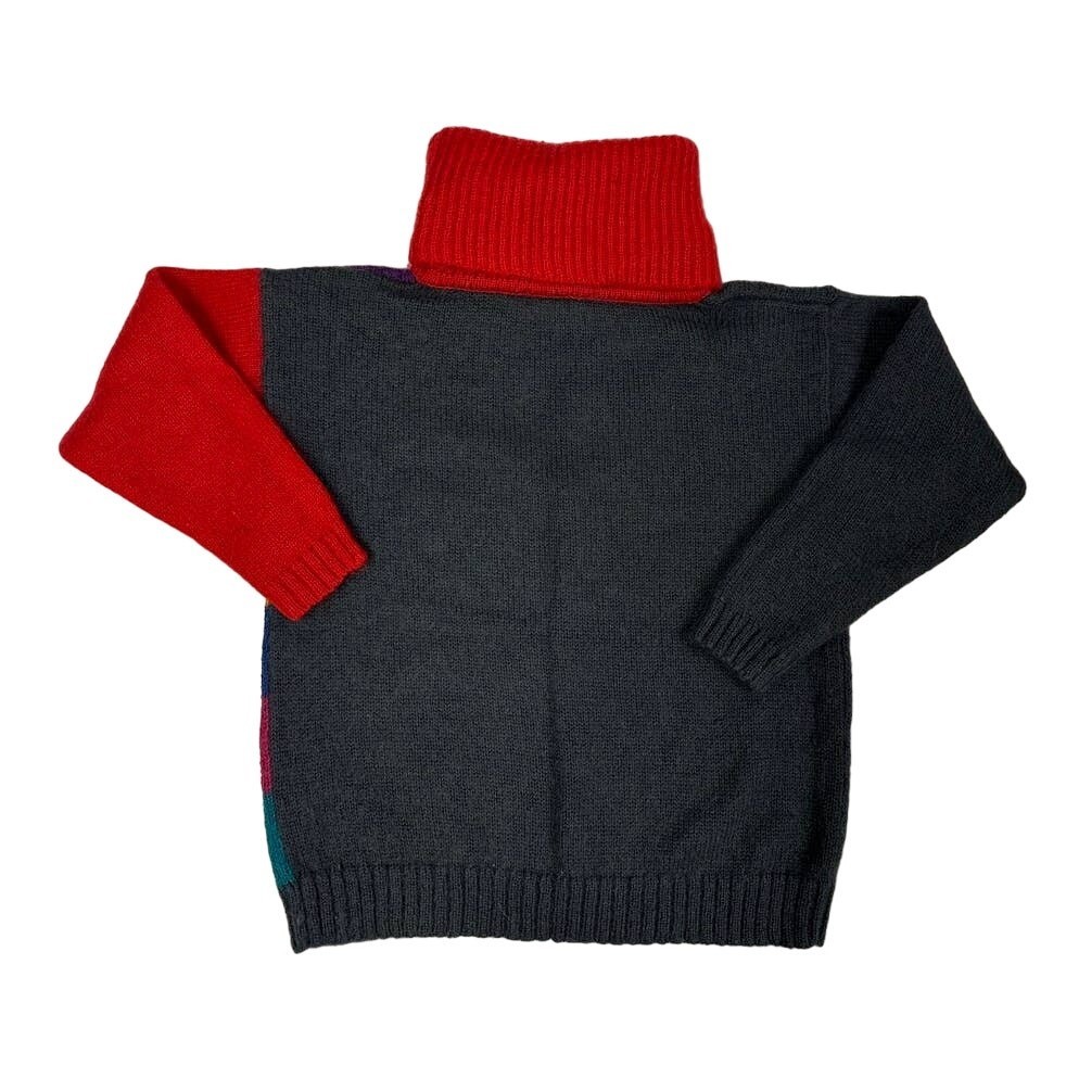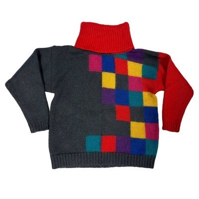 Vintage 1980s wool turtleneck sweater with bold colorblock design. Unisex style, medium-weight knit with ribbed trim and high neckline. A true retro statement piece that works perfectly for men or women.